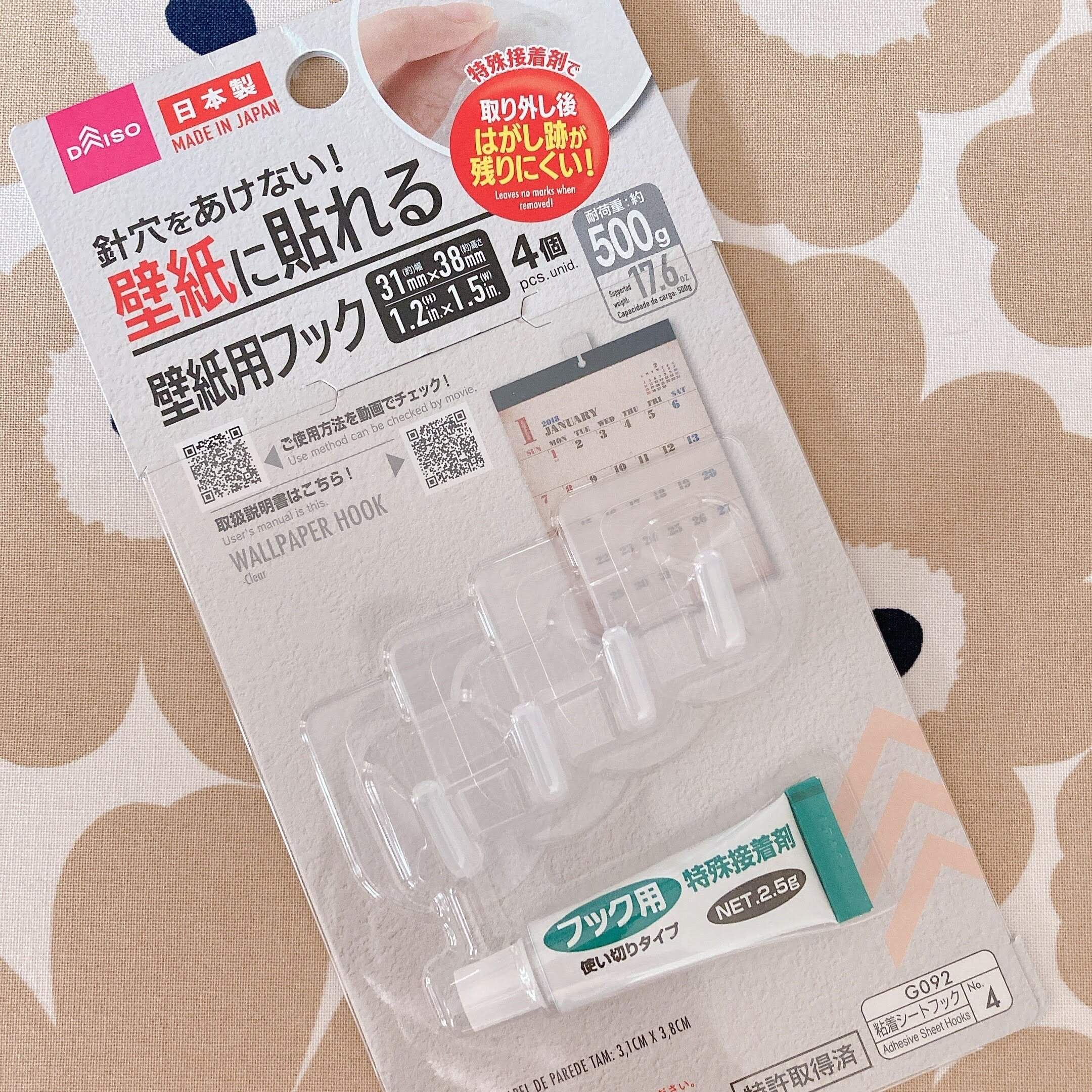 1.針穴をあけない!壁紙に貼れる壁紙用フック(ダイソー)