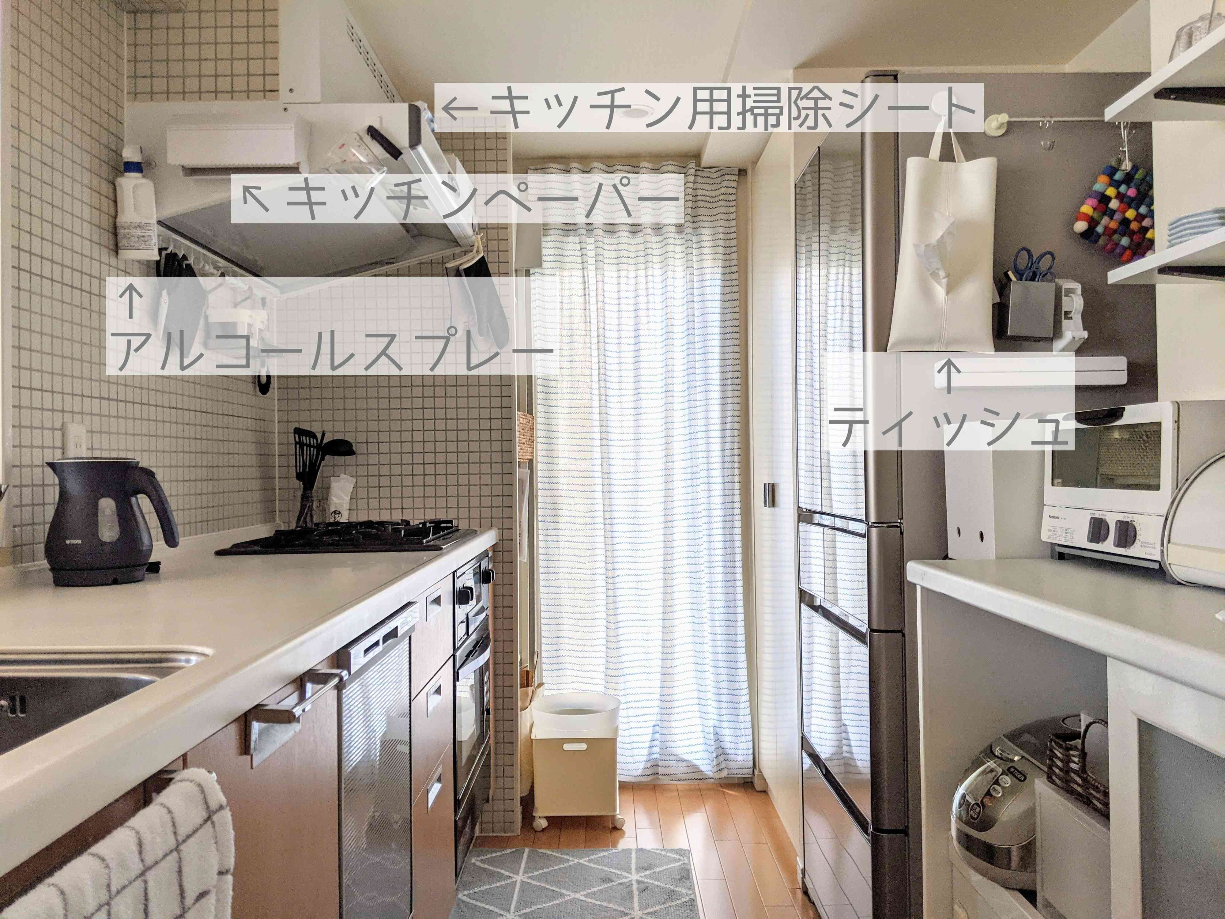 キッチンでは汚れの度合いに応じてティッシュやキッチンペーパーを使い分けています。一日の終わりには、換気扇の上にこっそり?置いているキッチン用掃除シートで作業台やシンクまわりを拭いて片付け完了です!