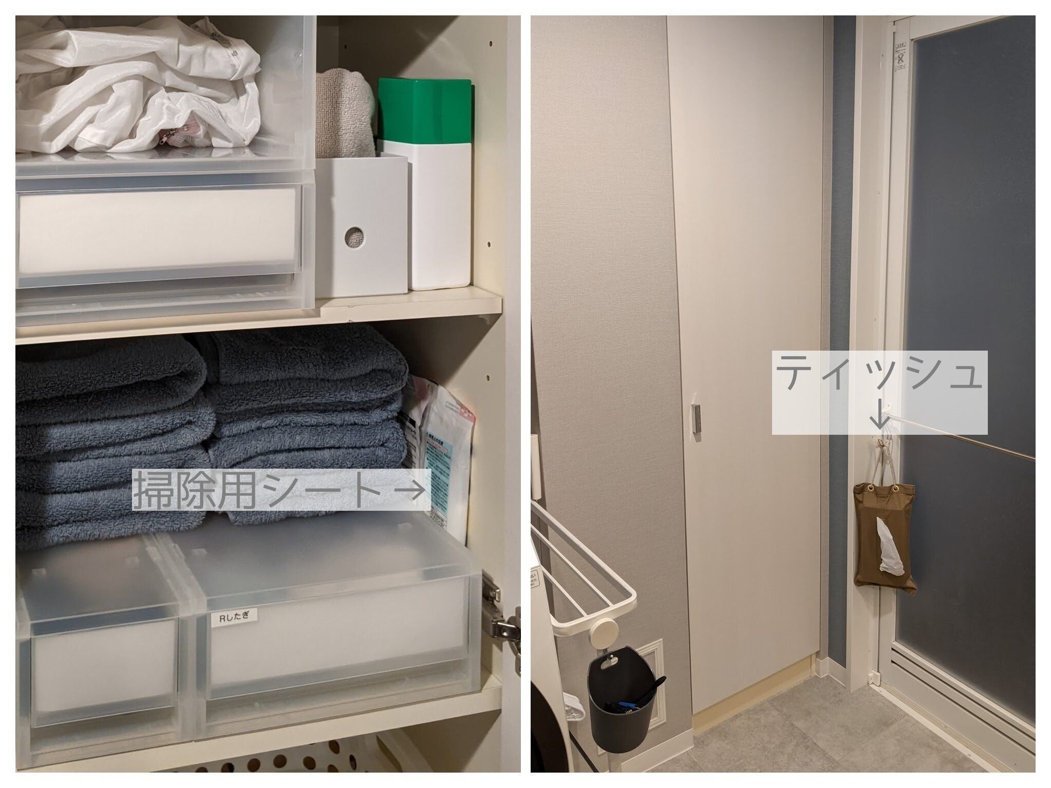 洗面所の収納の中には掃除用シートがあるので、床やお風呂の扉まわりなどの汚れが気になるときに使用。また、毎日お風呂のあとに髪の毛を捨てる作業が面倒にならないよう、扉にティッシュをかけています。