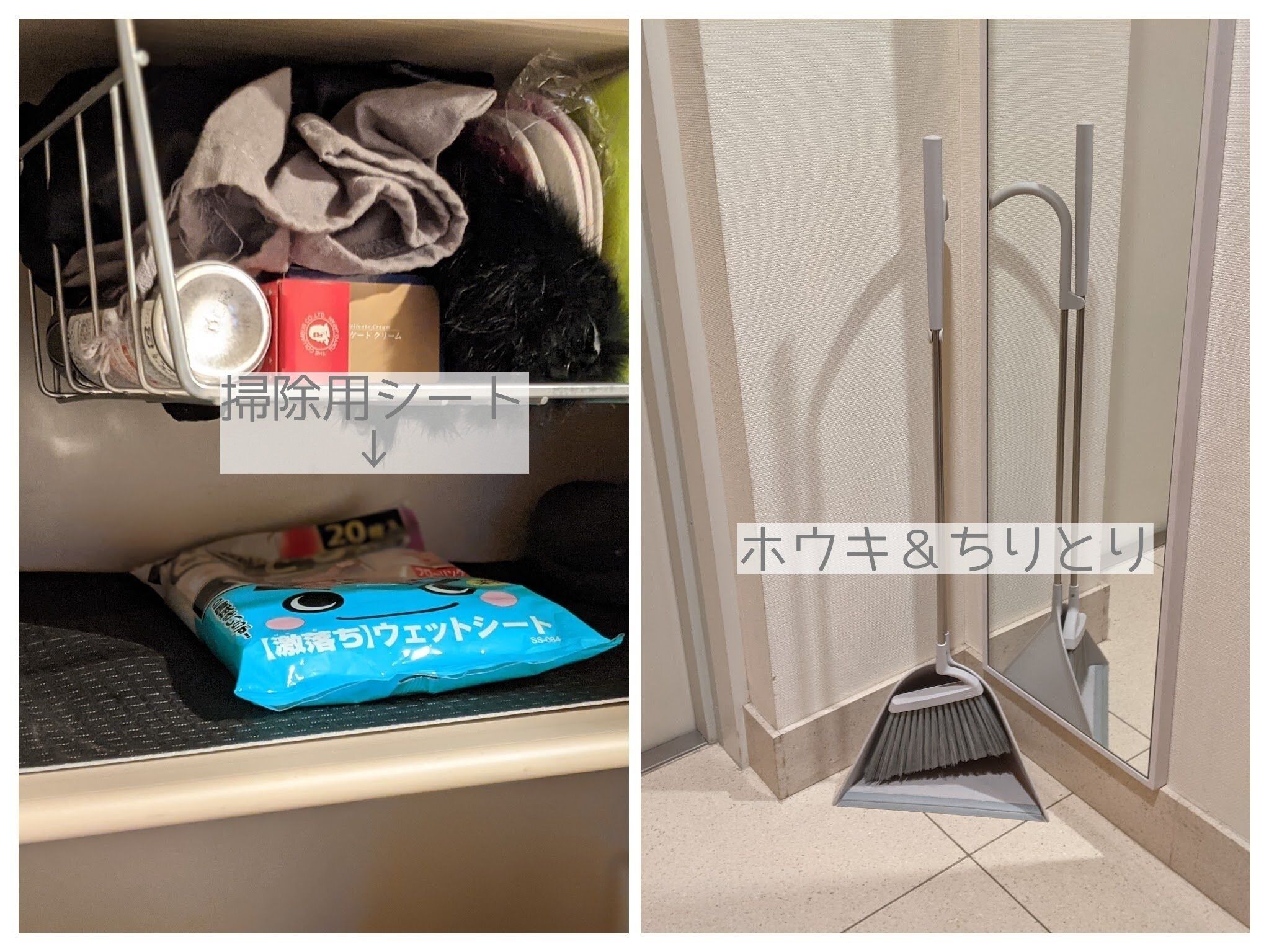下駄箱のなかにも掃除用シートを。扉や床、棚など、気になったら掃除ができる体制に。また、玄関の片隅にホウキとちりとりを置いておき、泥汚れが気になったら使用。ちりとりの中のゴミは週末に掃除機で吸い取ります。