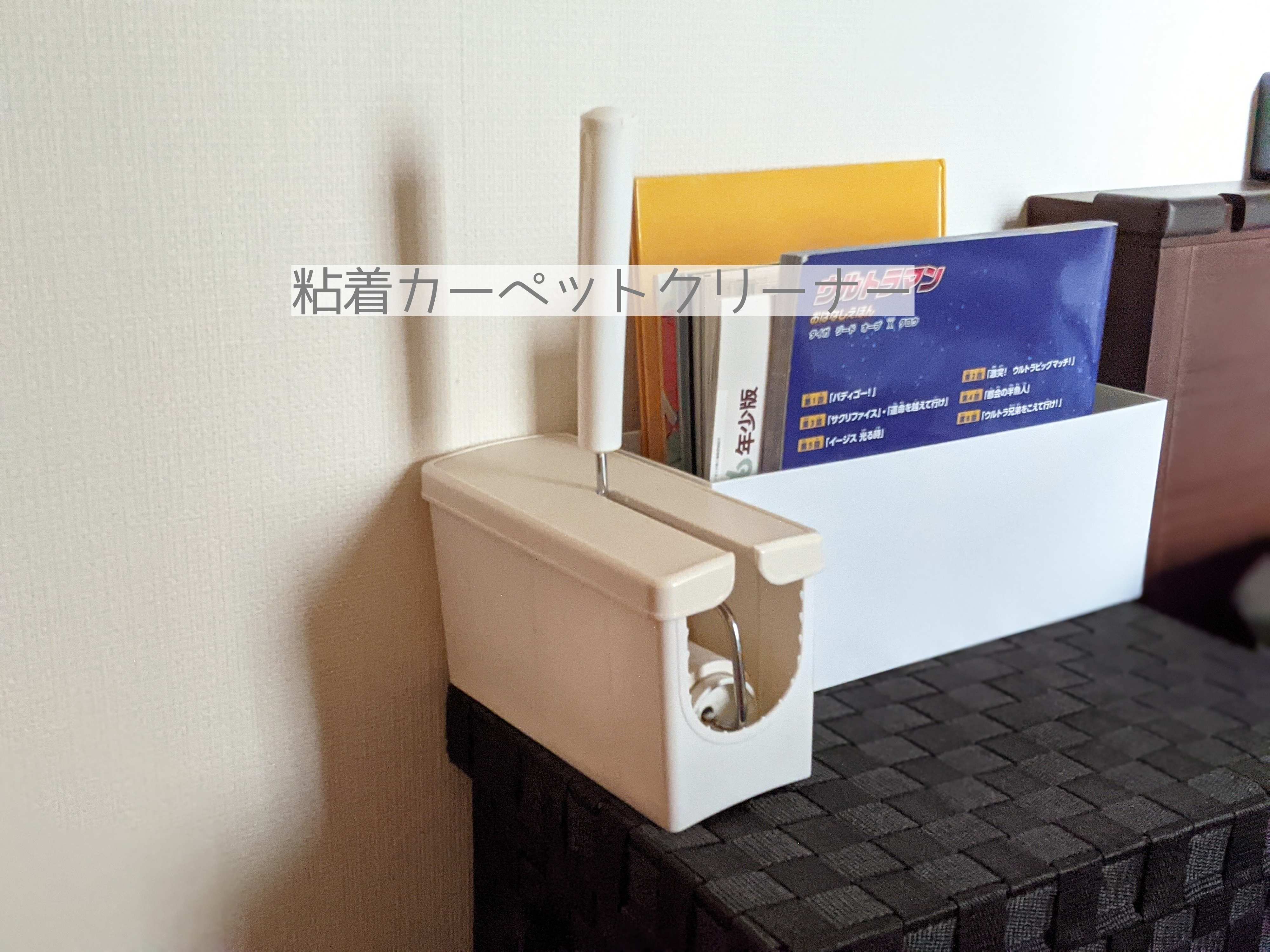 すぐ手に取れる位置に粘着カーペットクリーナーを。ラグや洋服についたホコリなど、コロコロします。テレビ台の中にはほこり取り用のワイパーも入っています。