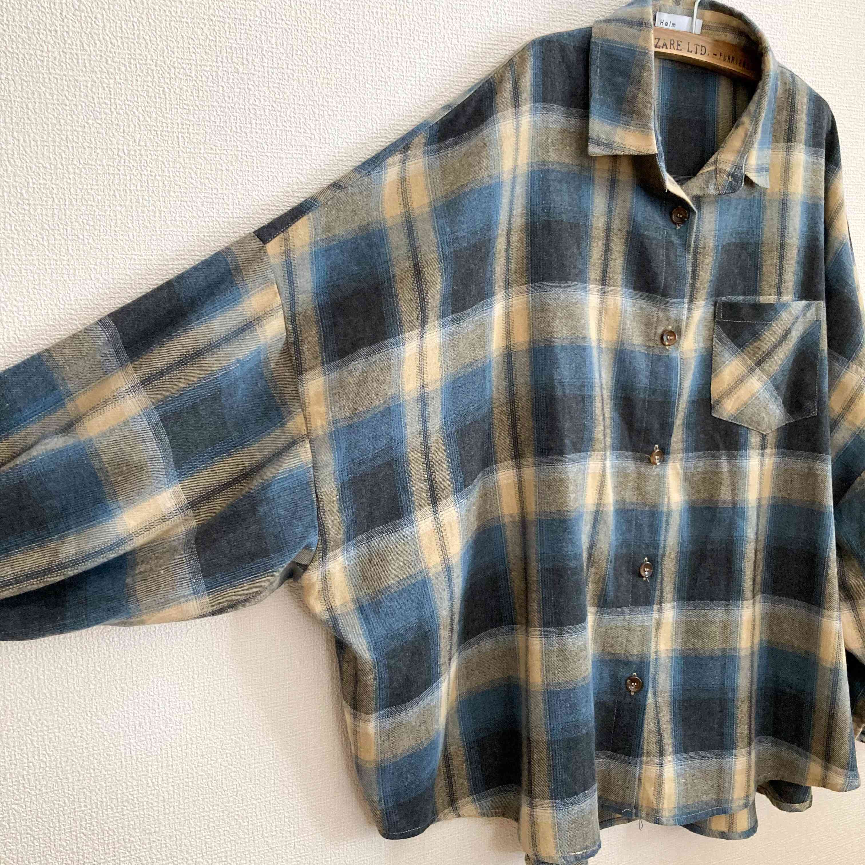 くすんだブルーにイエローベージュの大きめチェックが大人かわいいシャツ。ほんのり起毛した生地は柔らかくて温かみがあります。