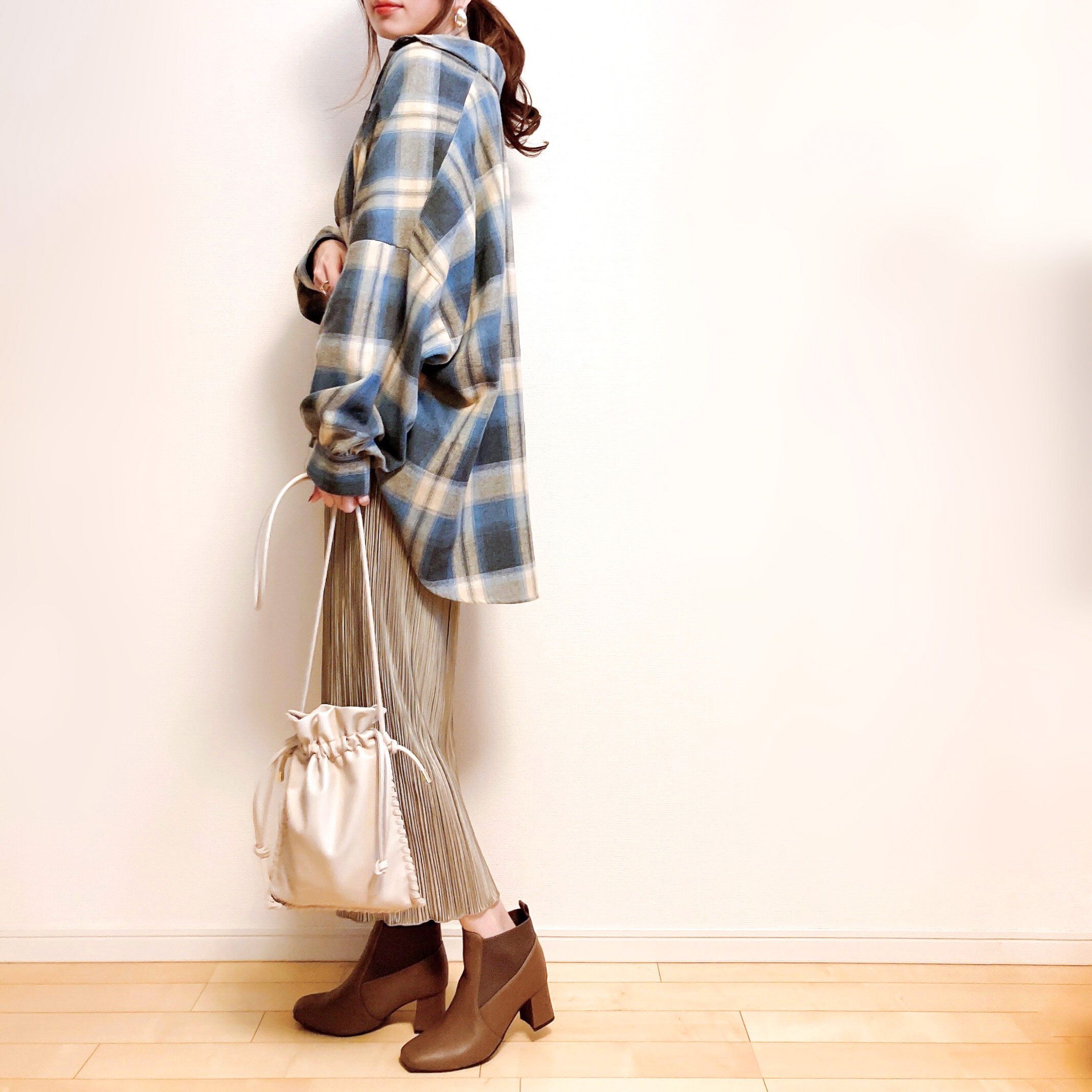 チェックシャツはカジュアル合わせが定番でかわいいですが、こちらのプリーツスカートのような少し女性らしいアイテムと合わせるのも大人っぽい雰囲気になってオススメです。