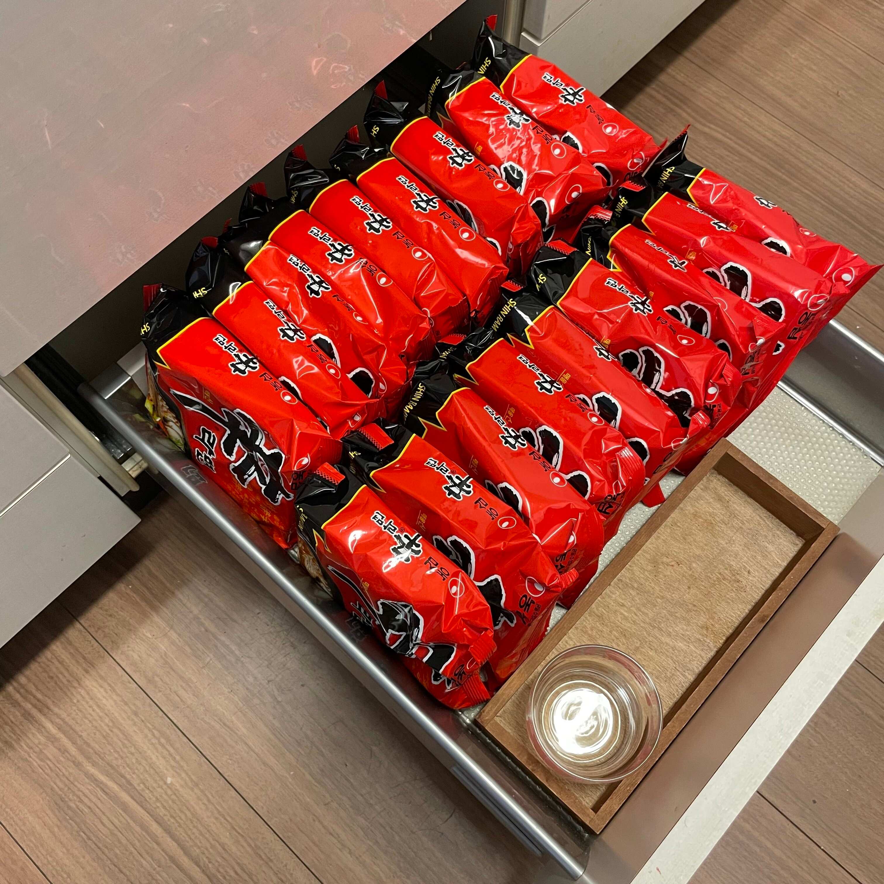 先日は、コストコから辛麺を1ケース持ち帰ったのですが、何もない引き出しのおかげで、箱から全てだして収納することができました。