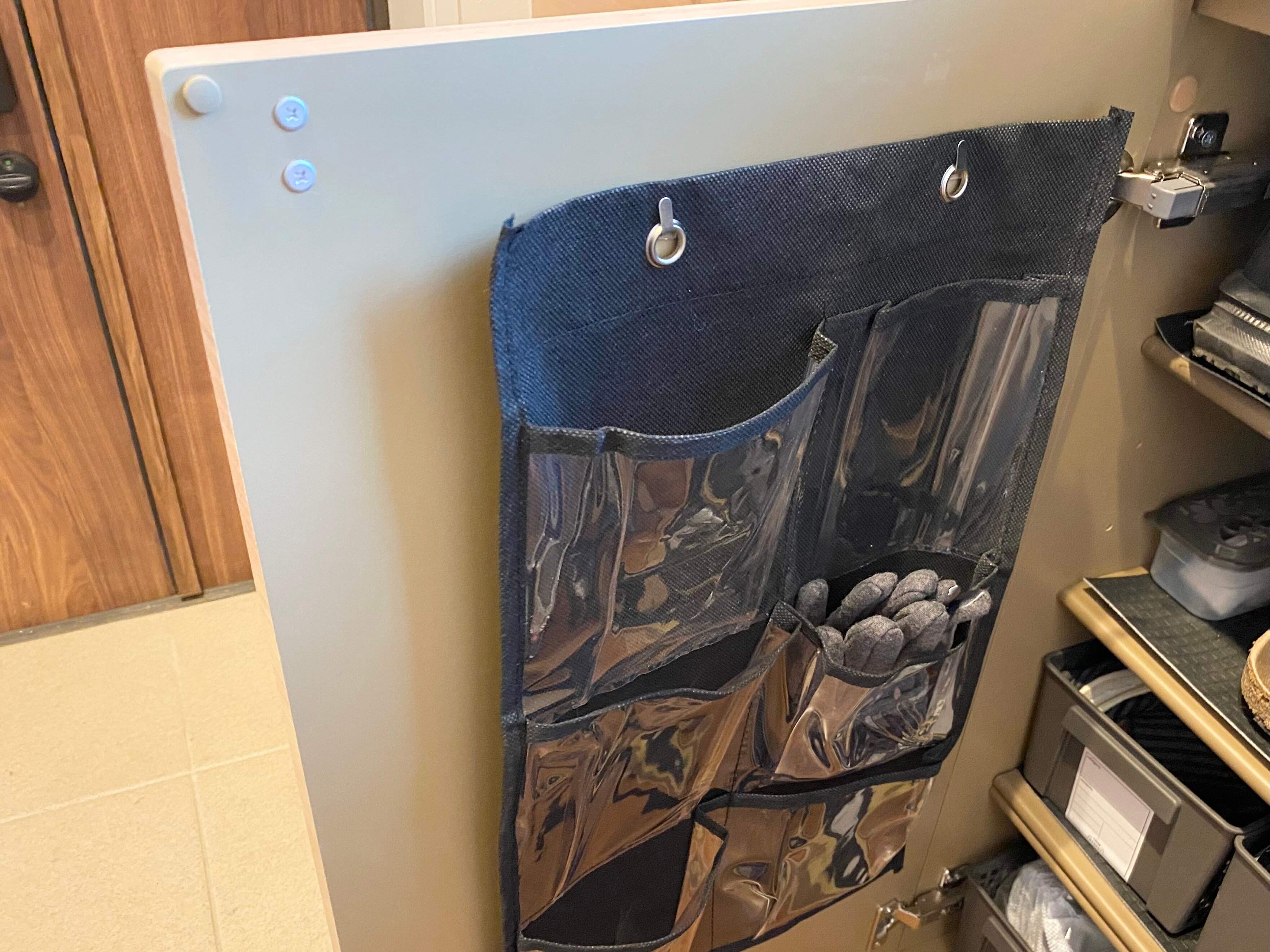 これら動作がスムーズに行えるように、玄関ドアにペーパーカッターをマグネットで貼りつけて、下駄箱の中にはゴミ箱・ビニール紐を置いています。