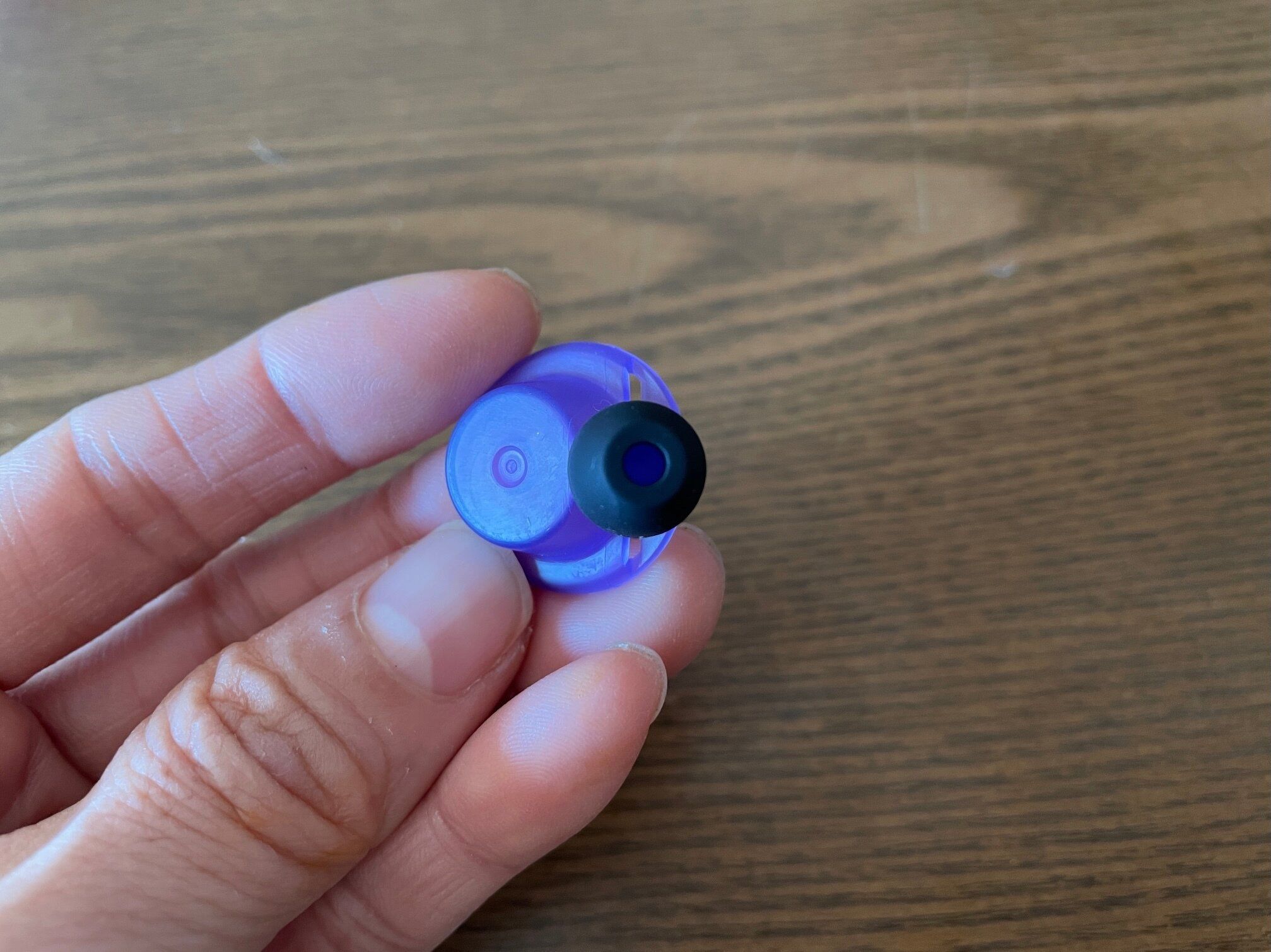 はずは、紫の耳栓本体に、黒いイヤーピースを取り付けます。一度耳に装着してみて、SかMのどちらかピッタリくる方を選んでください。
