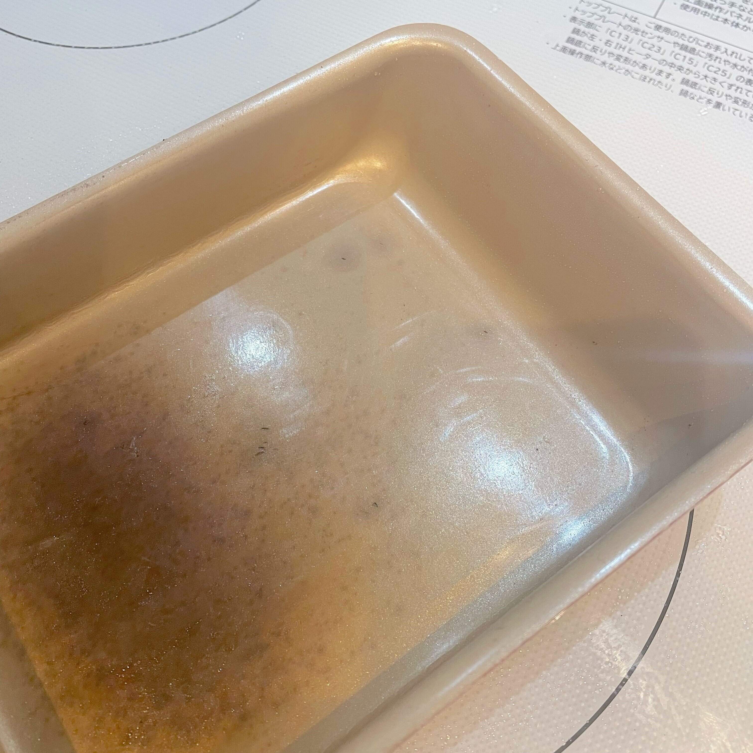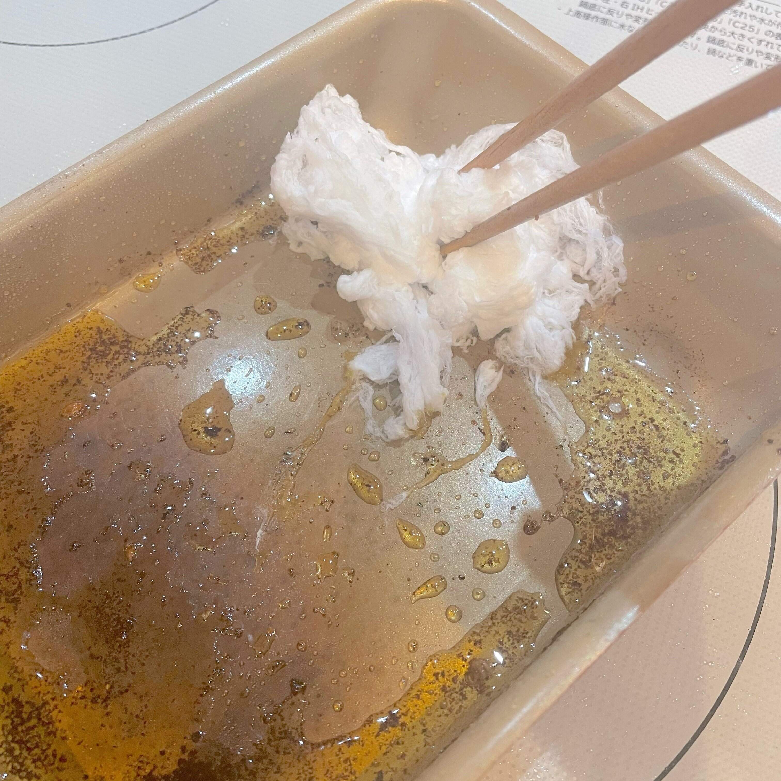 フライパンのギトギト油をすべて吸ってくれたので、油残りがなくこんなにキレイになりました!この状態なら洗い物もラクにできますね。