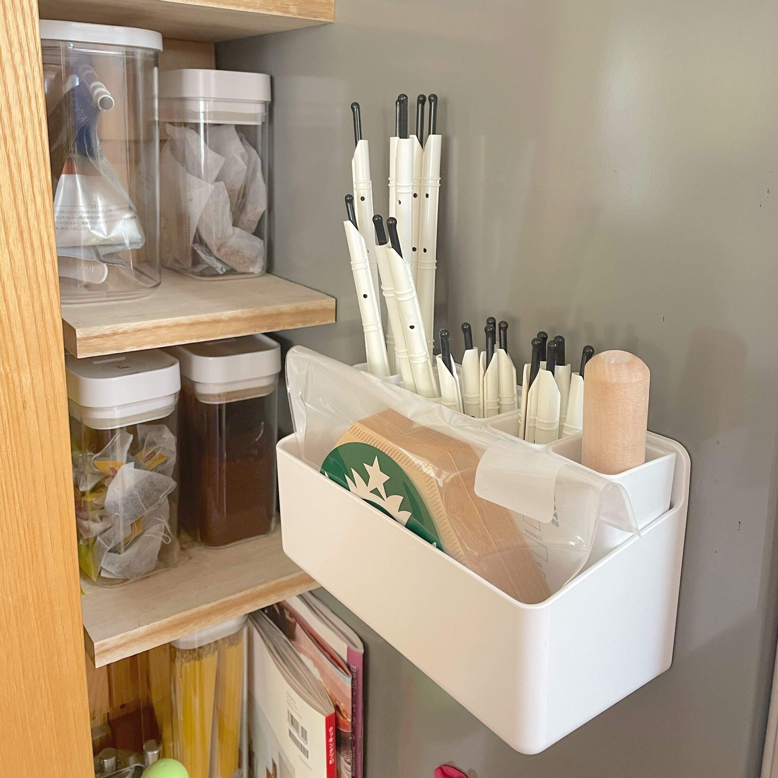 わが家はボトルホルダーワイドを使って袋とじやコーヒーフィルターなど細々したものを浮かせて収納することができました。