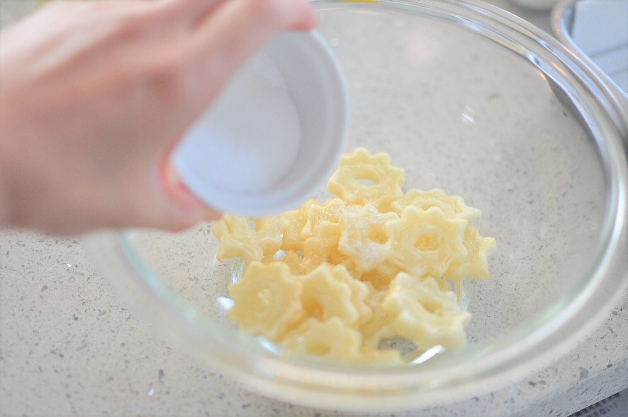 ホットケーキミックスと違って生地に甘味がないので、グラニュー糖をしっかりからめるのがおいしさのポイントとなります。
