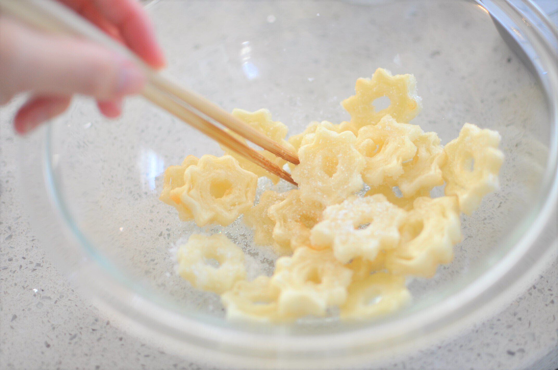 揚げたらすぐにグラニュー糖を加えます。