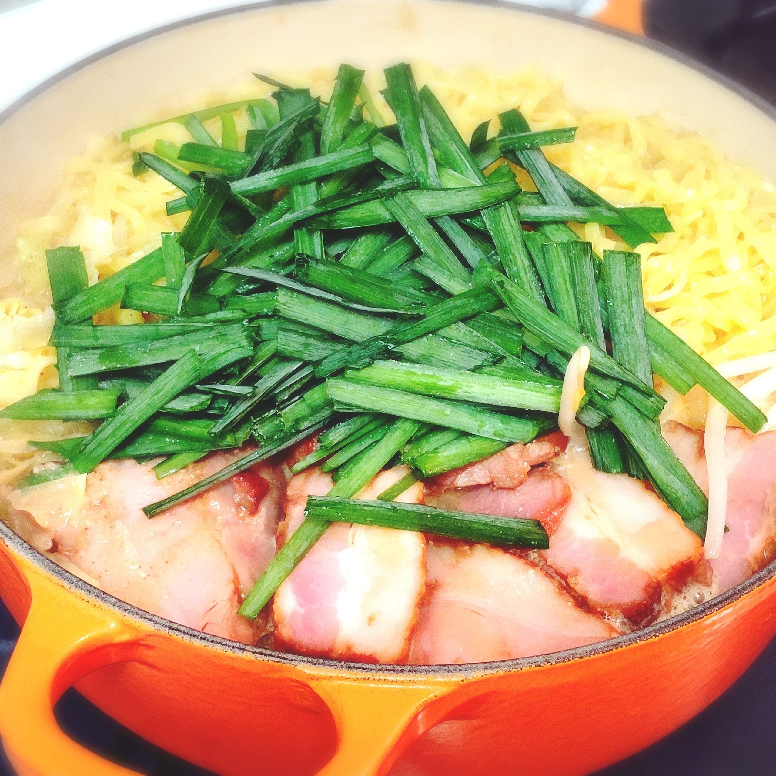 冷蔵庫に半分残ったキャベツを全部入れ、他にモヤシやニラも投入。野菜ラーメンをイメージしました。