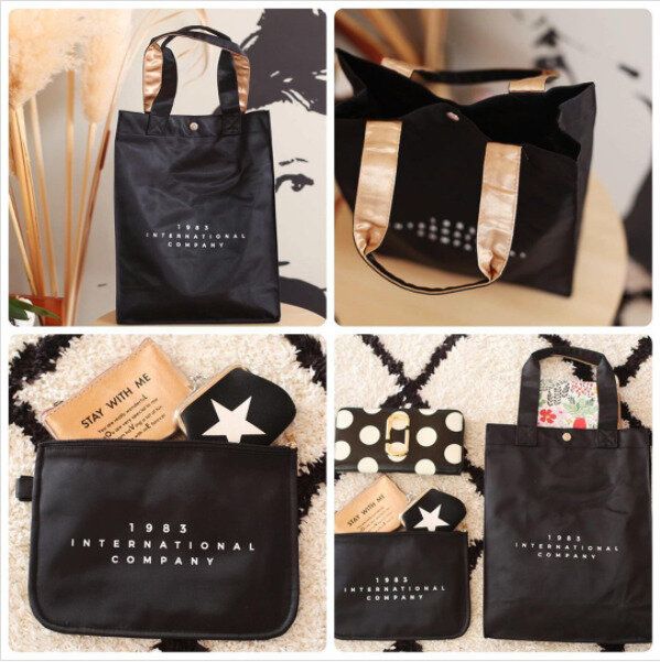 こちらのタイポグラフィックデザインのポーチ&トートバッグもダイソーで購入できるなんて驚きです。トートの持ち手裏はゴールドの裏地が使われていることでより高級感を感じさせる高コスパアイテムとなっています。