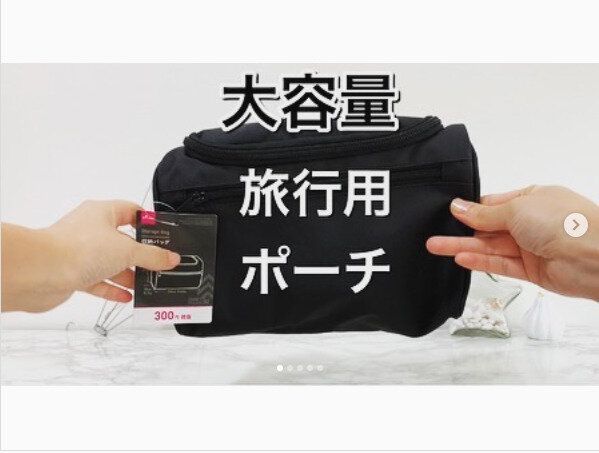 300円アイテムのバニティポーチ。化粧小物を入れるのに便利ですが、薄型でありながら収納力があるので、小物の収納にももってこい。文房具などの持ち運び用にも便利なんですよ。