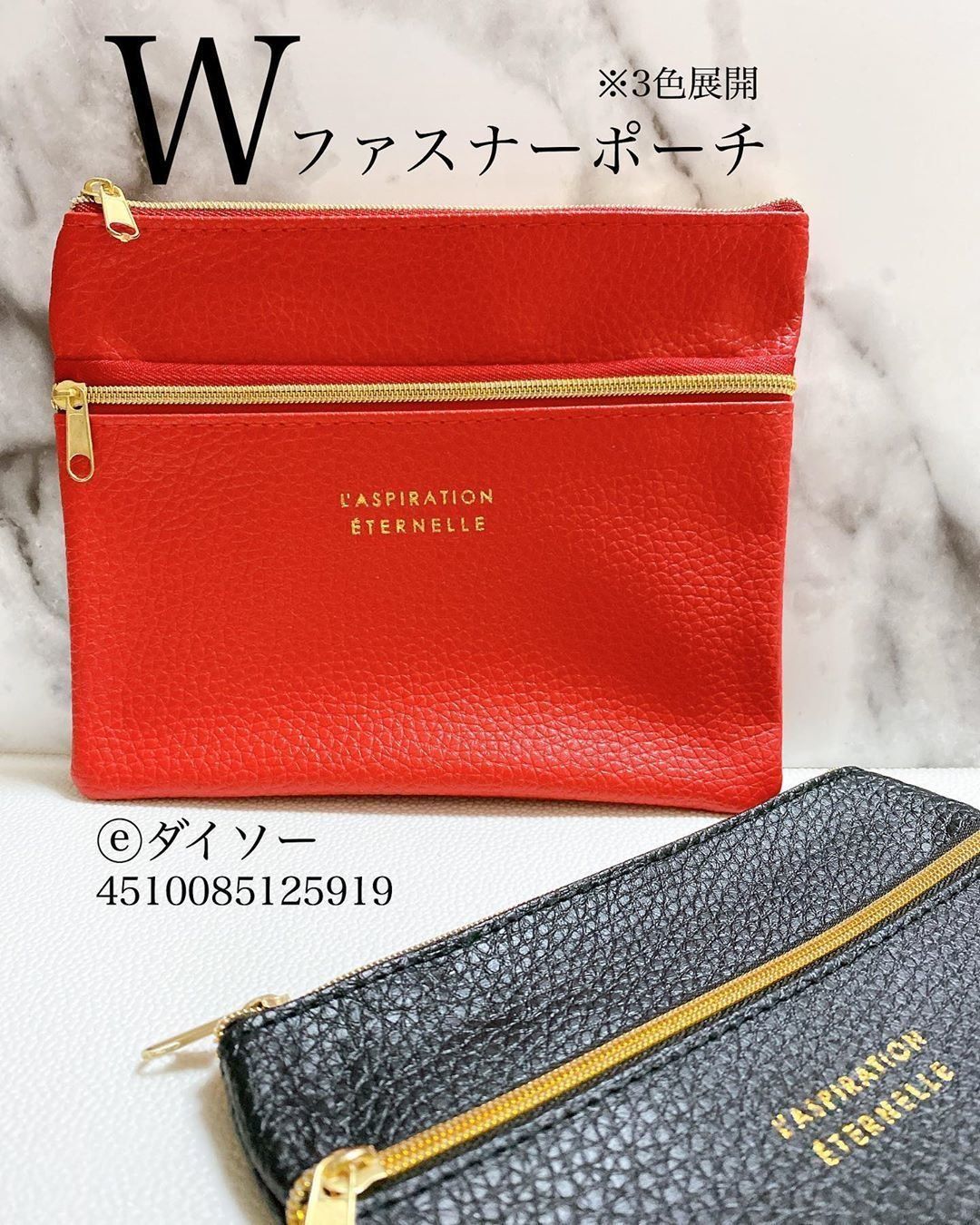 Wファスナーポーチは、高見えデザインのポーチ。赤、黒、ベージュの3色展開で、それぞれ印象が異なって見えるかわいさ。Wファスナーでアイテムを分けて収納できますね。