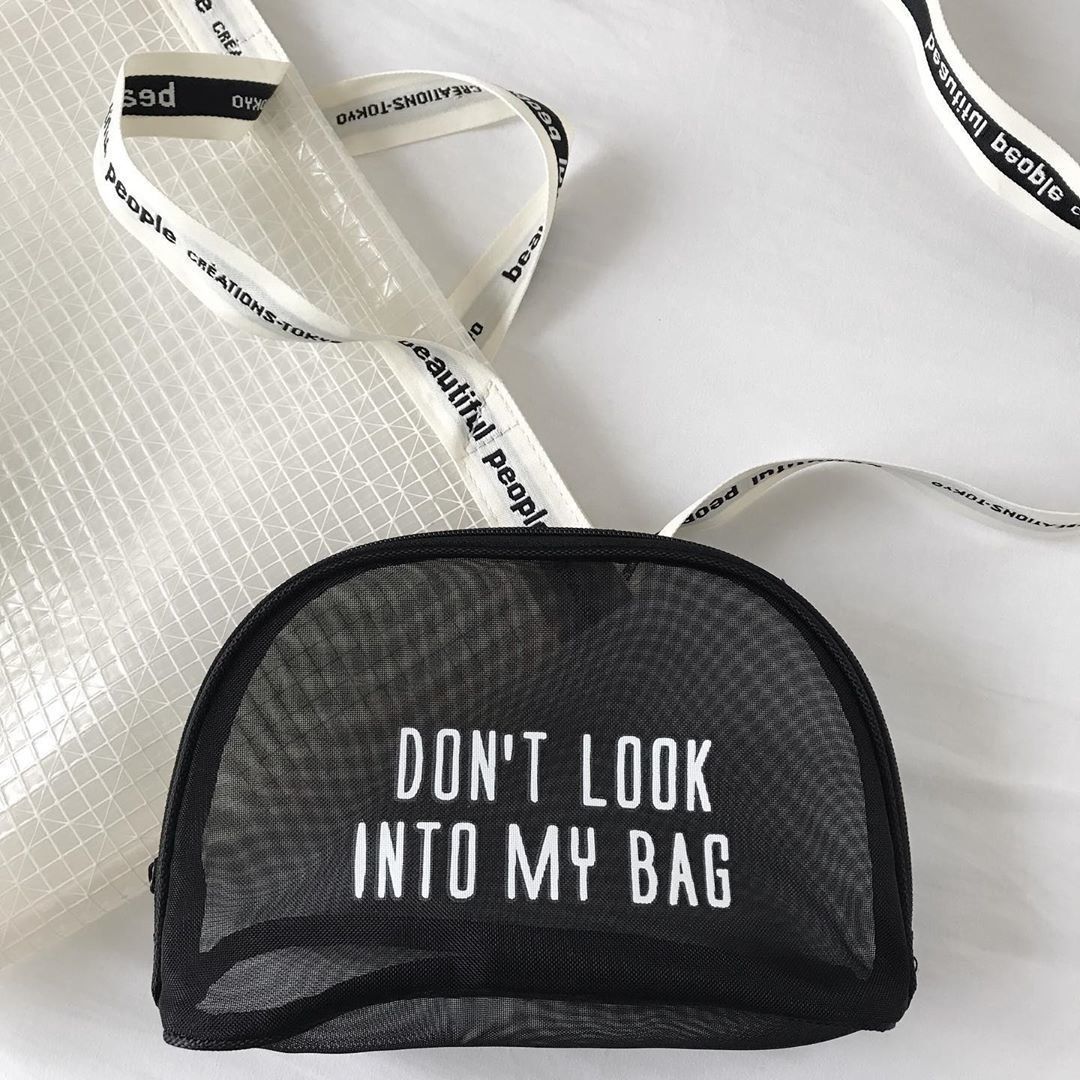 クリアバッグにポーチを合わせれば、こんなにおしゃれ!コーディネートを引き立ててくれるアイテムに変身です。どちらもビニール製なので、とにかく軽いのもいいですよね。中から見える「DON’T LOOK INTO MY BAG(バッグの中を見ないで)」のロゴがとってもキュート。