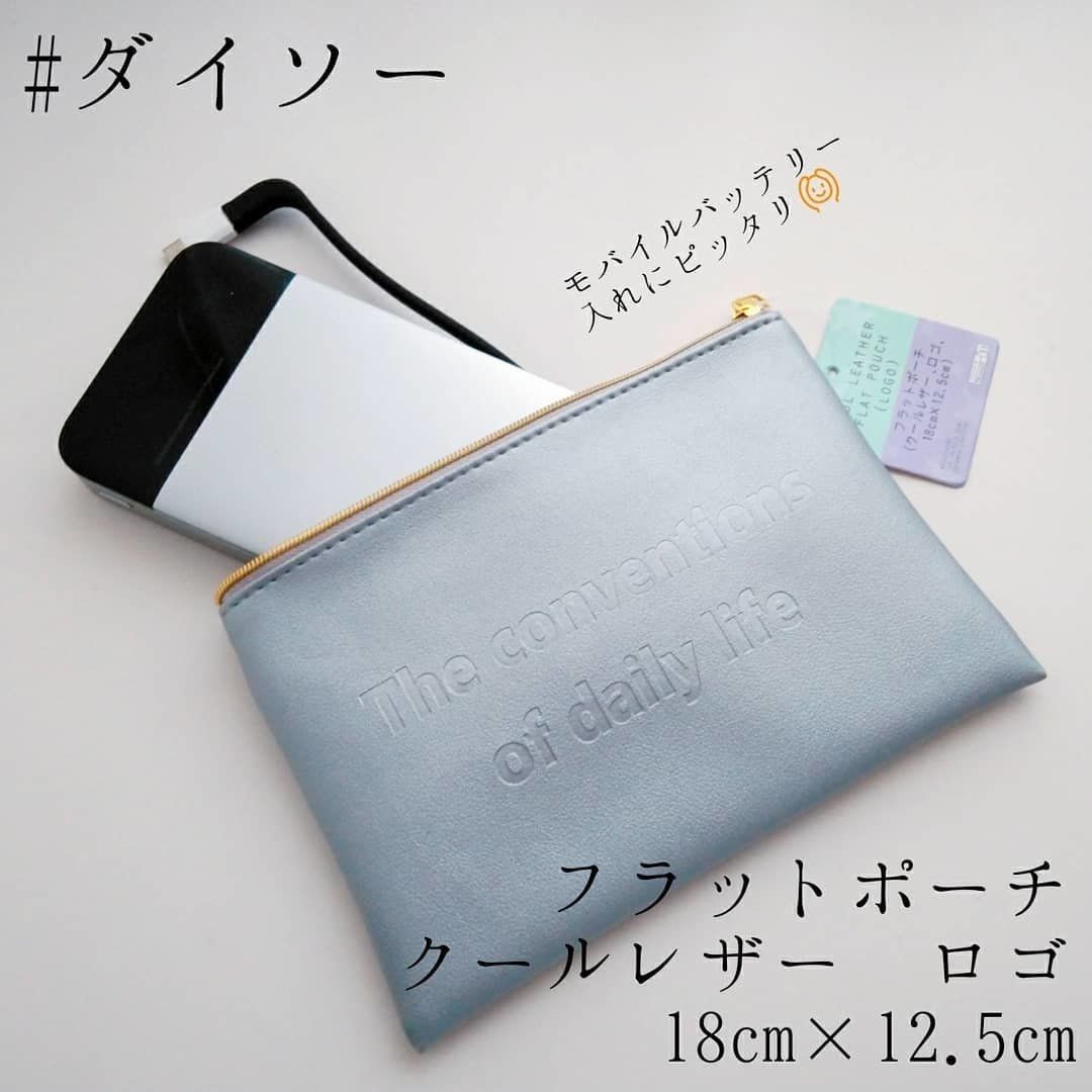 モバイルバッテリーを入れるのに、ちょうどいいサイズのフラットポーチです。レザー風の生地に、アルファベットロゴが型押しされていて、高級感があるデザインです!