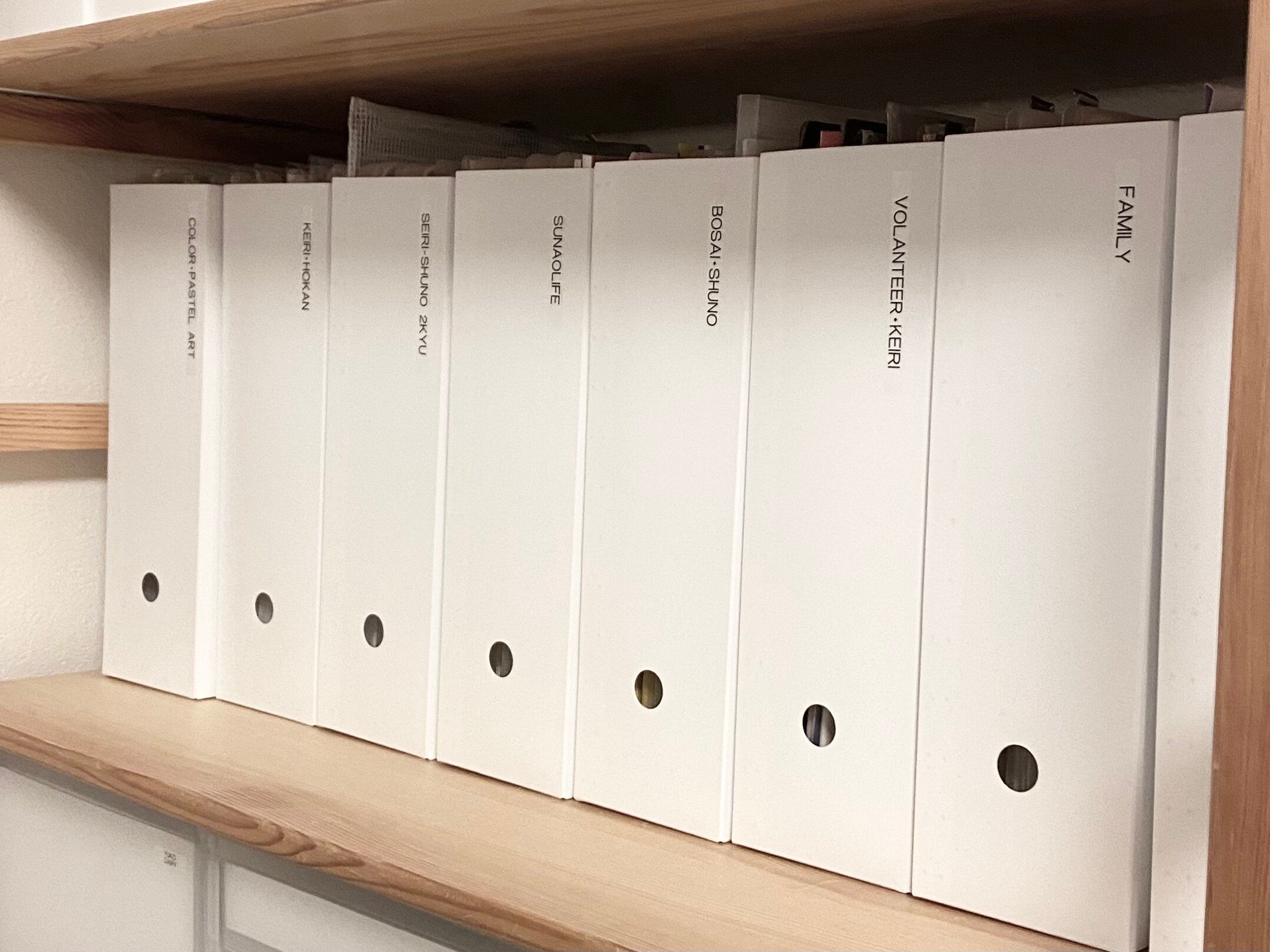 こんな風にジャンルごとに分けて入れてみました。ここには毎日動くファイルはありませんので、ファイルボックスに収納されていても出し入れに手間取ることはありません。