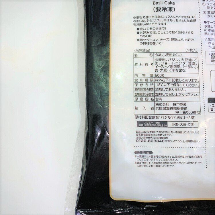 原材料名:小麦粉、バジル、大豆油、ごま、ショートニング、食塩、イースト/膨張剤、(一部に小麦・大豆・ごまを含む)