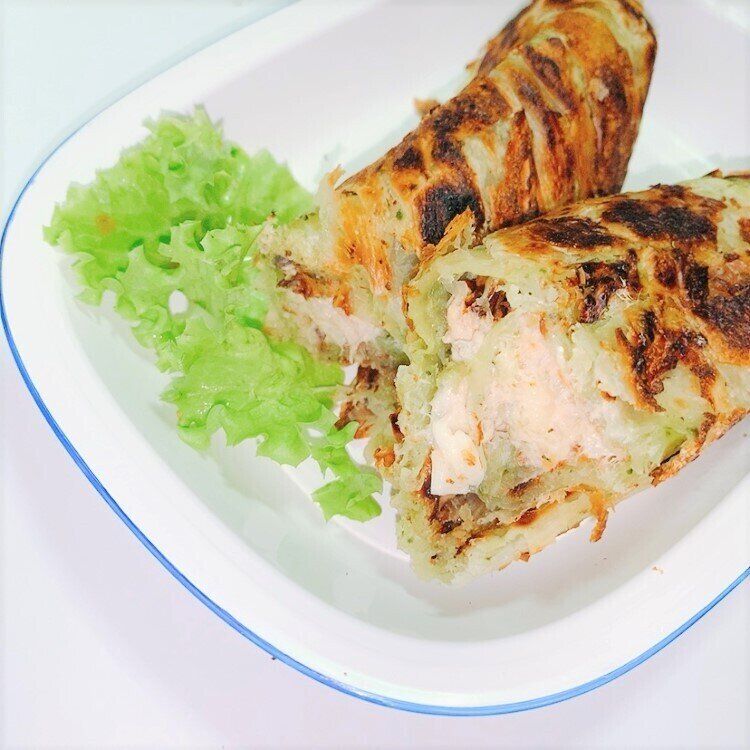 シンプルに、焼いただけでもバジル風味を感じる薄焼き餅です。チーズ・ハム・ツナなどを巻くとまるでブリトーのよう。レタスとマヨネーズを加えたら、サラダラップにもなります。