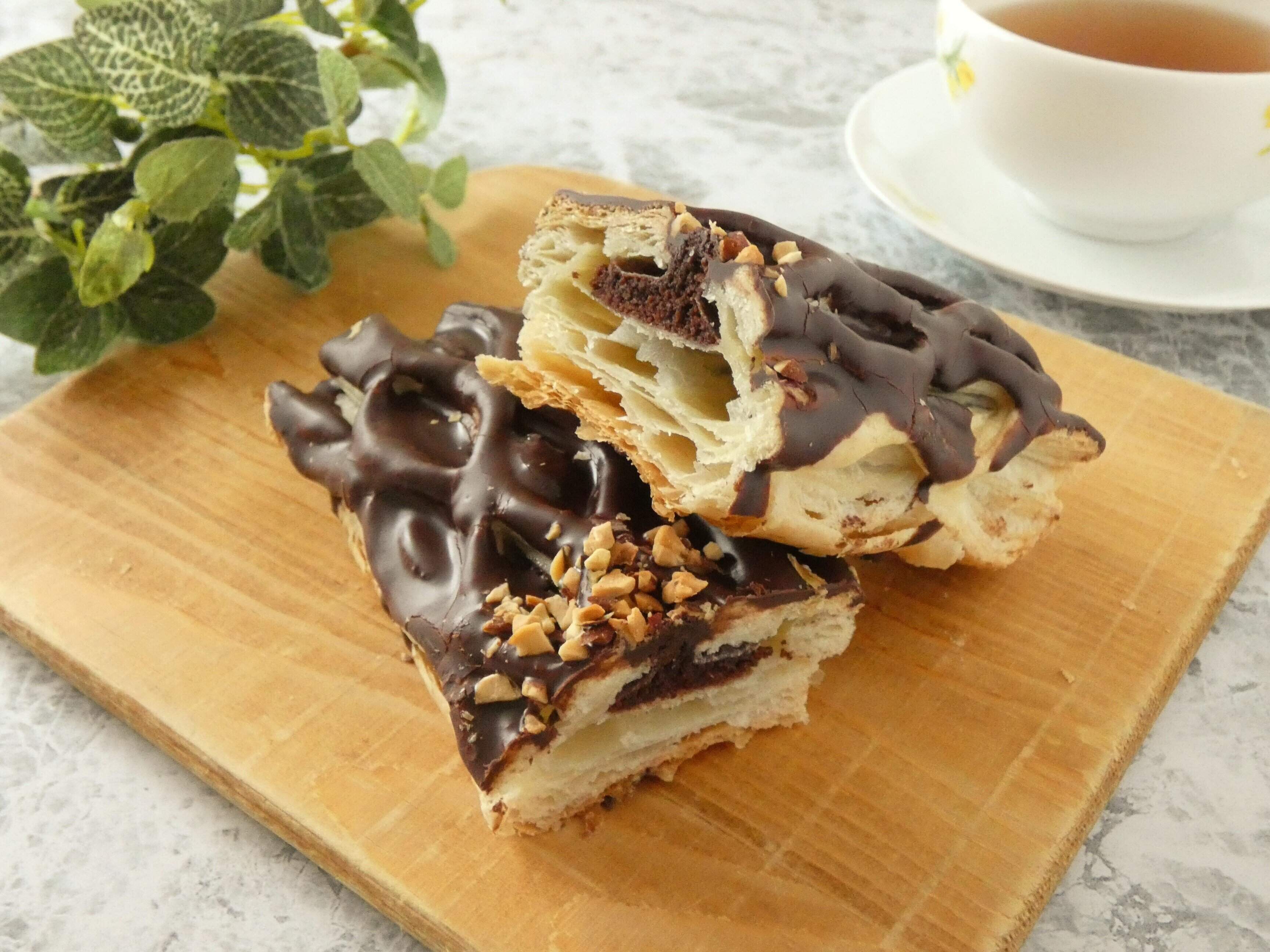 カットするとパイ生地はサクサク。パイ生地の間にはチョコケーキ生地と角切りのチョコがぎっしりと入っていて、表面はチョココーティングしてあります。