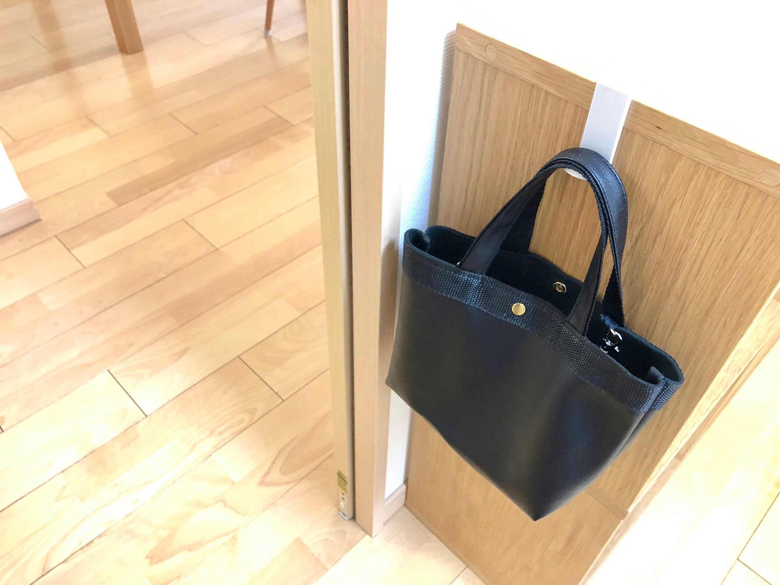 玄関でエコバッグや日傘などのお出かけグッズをかけたり、忘れ物をしないように目につくところに子どもの学校用品をかけたり。