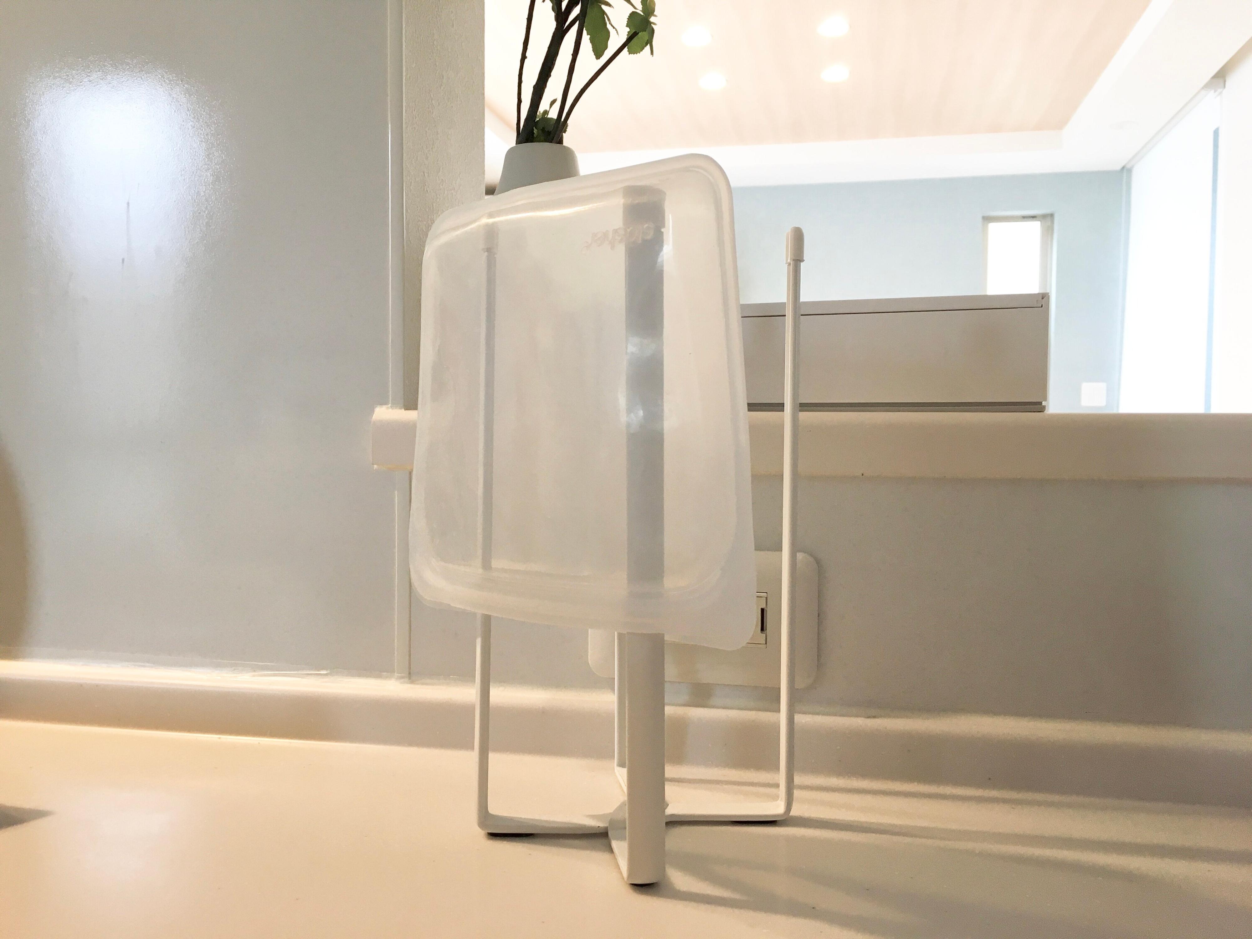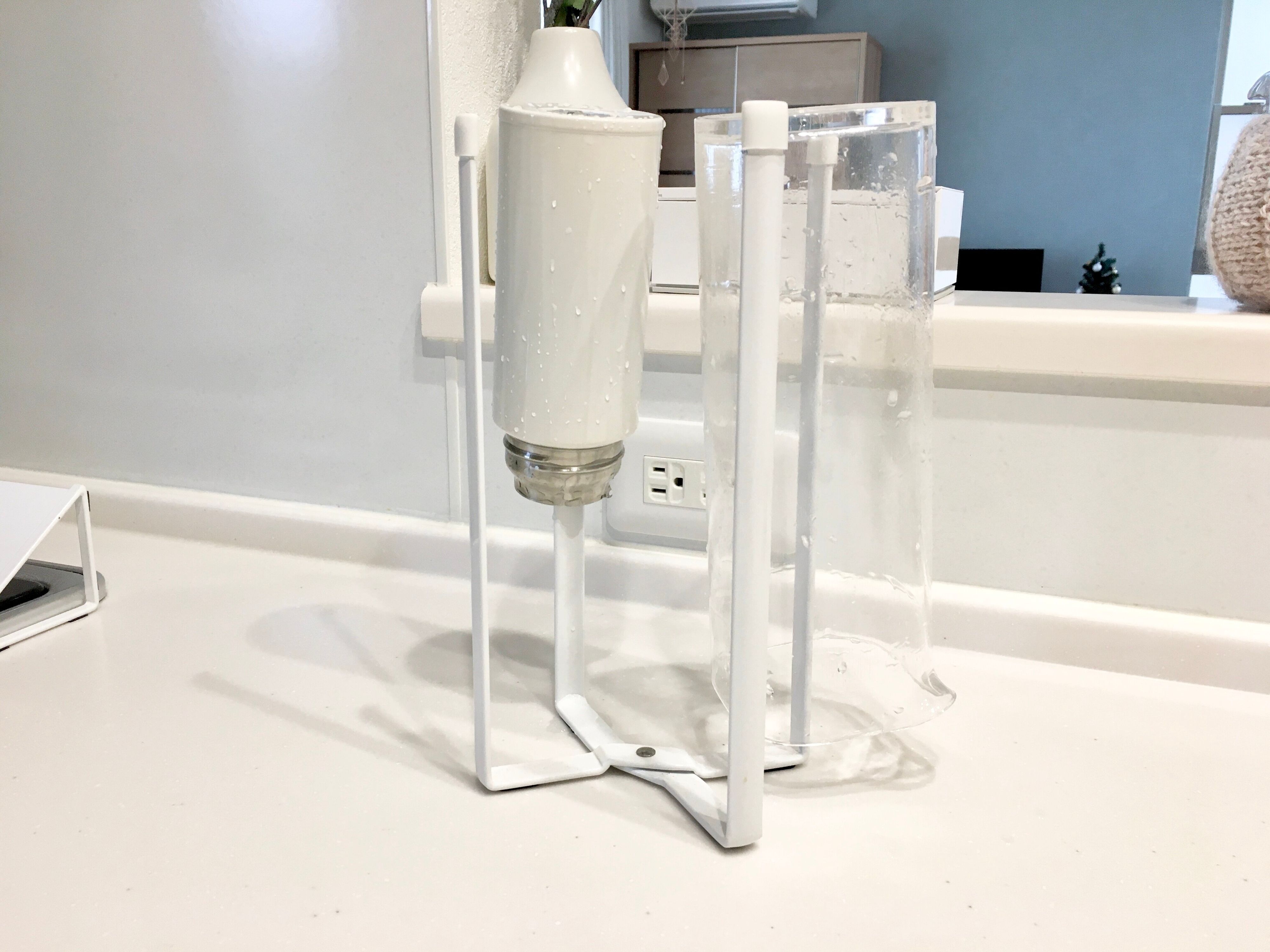 上記の画像は小さい保存袋なので2点を使って干していますが、大きい保存袋だと4点を使って干すことが多いです。プラスチック製の保存袋は乾かしにくいので、このスタンドがあるととても便利。