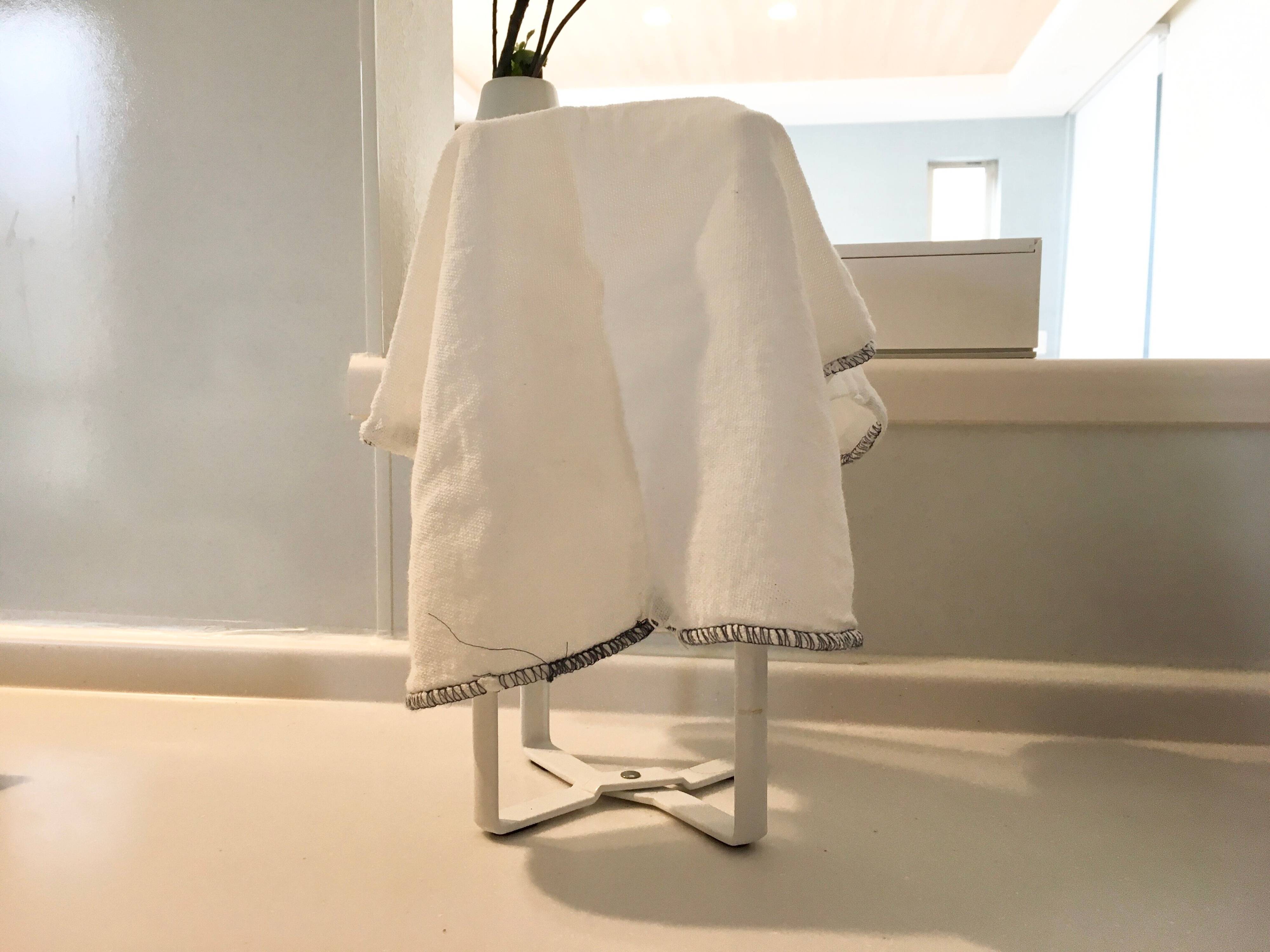 重すぎるものは倒れてしまいますが、このように双方から立てかけるとバランスよく干すことが可能。子どものエプロンもスタンドにかけるとよく乾きます。