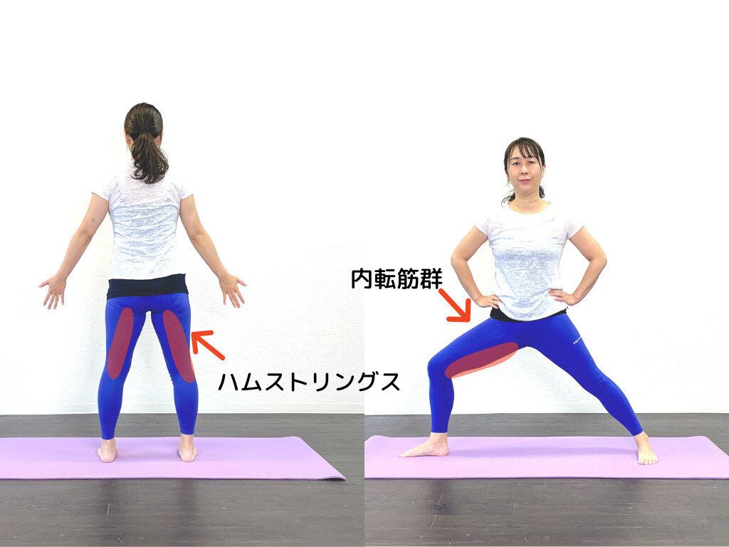 太ももの内側(内転筋群)と太ももの裏側の筋肉(ハムストリングス)にジワジワ効いているのを感じます。