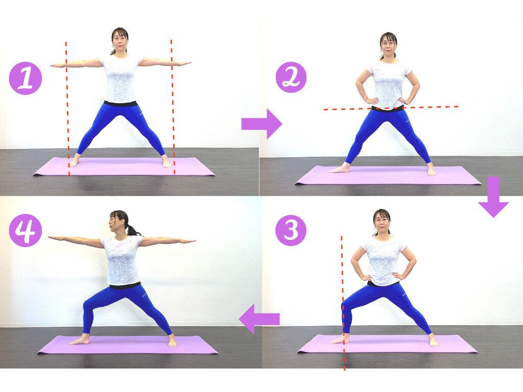 (1) 両脚を肩幅2倍程度に開きます。目安は両腕を広げ、手首の下あたりにかかとがくる程度に広げます。