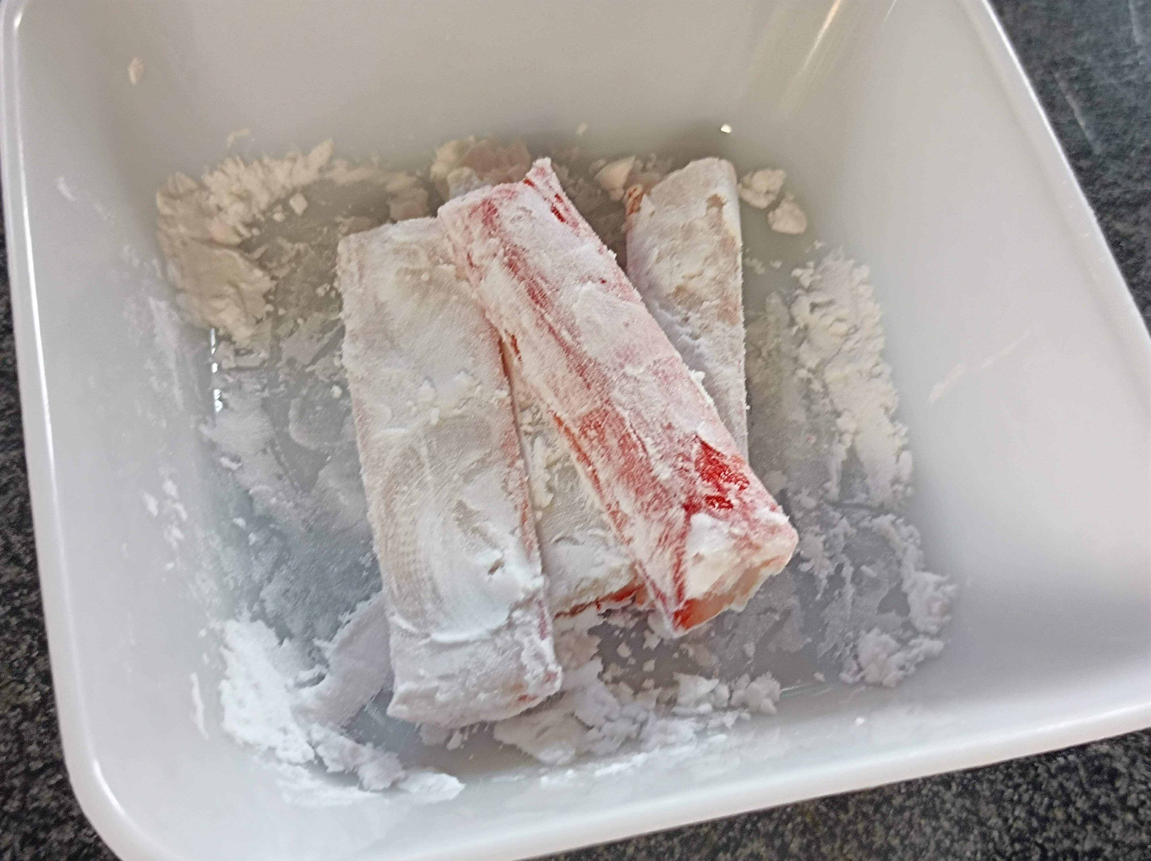 1. カニカマに片栗粉をまぶします。