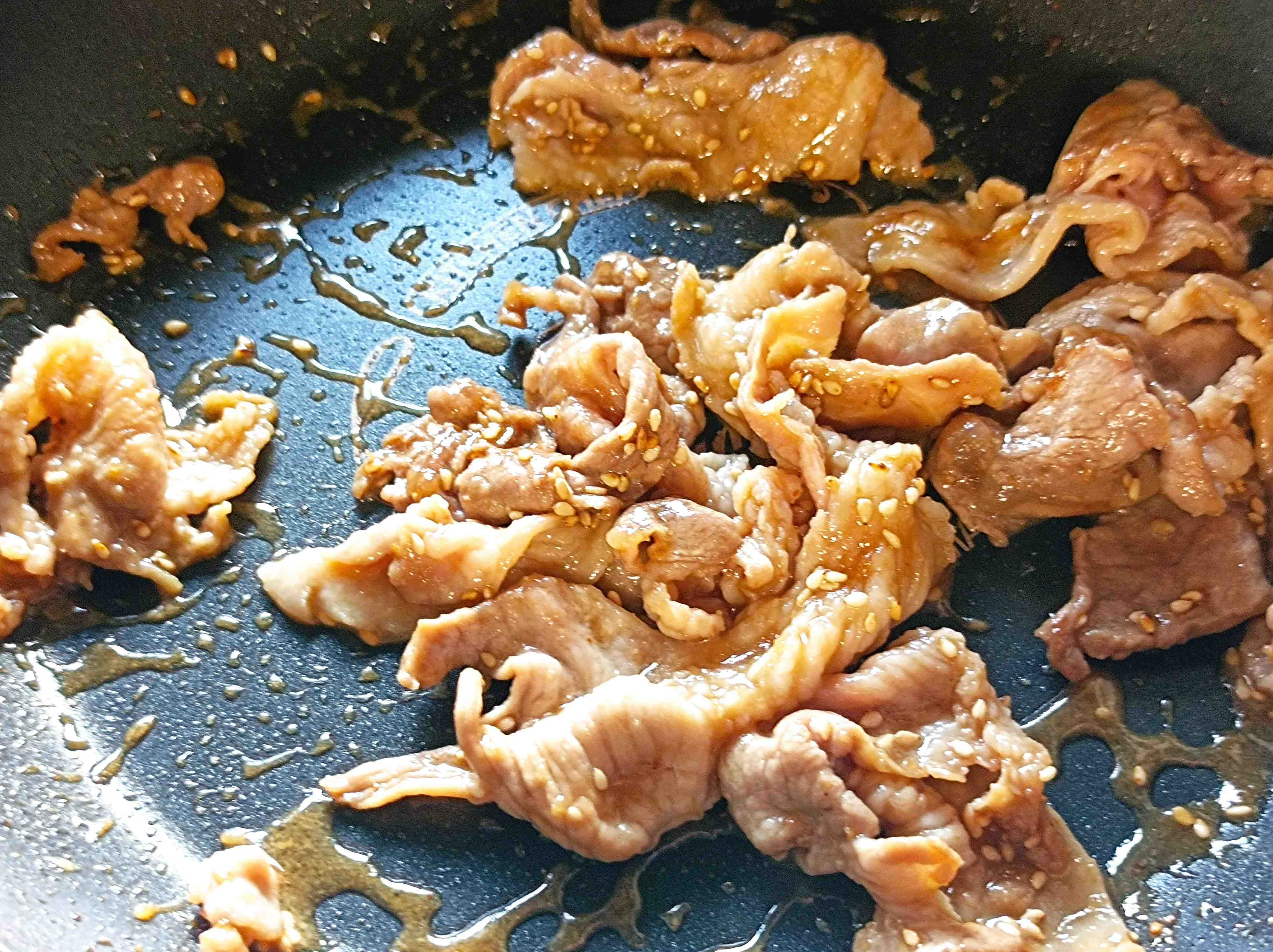 3. 豚コマ肉に焼肉のたれを絡めて焼いて、白胡麻を絡める。
