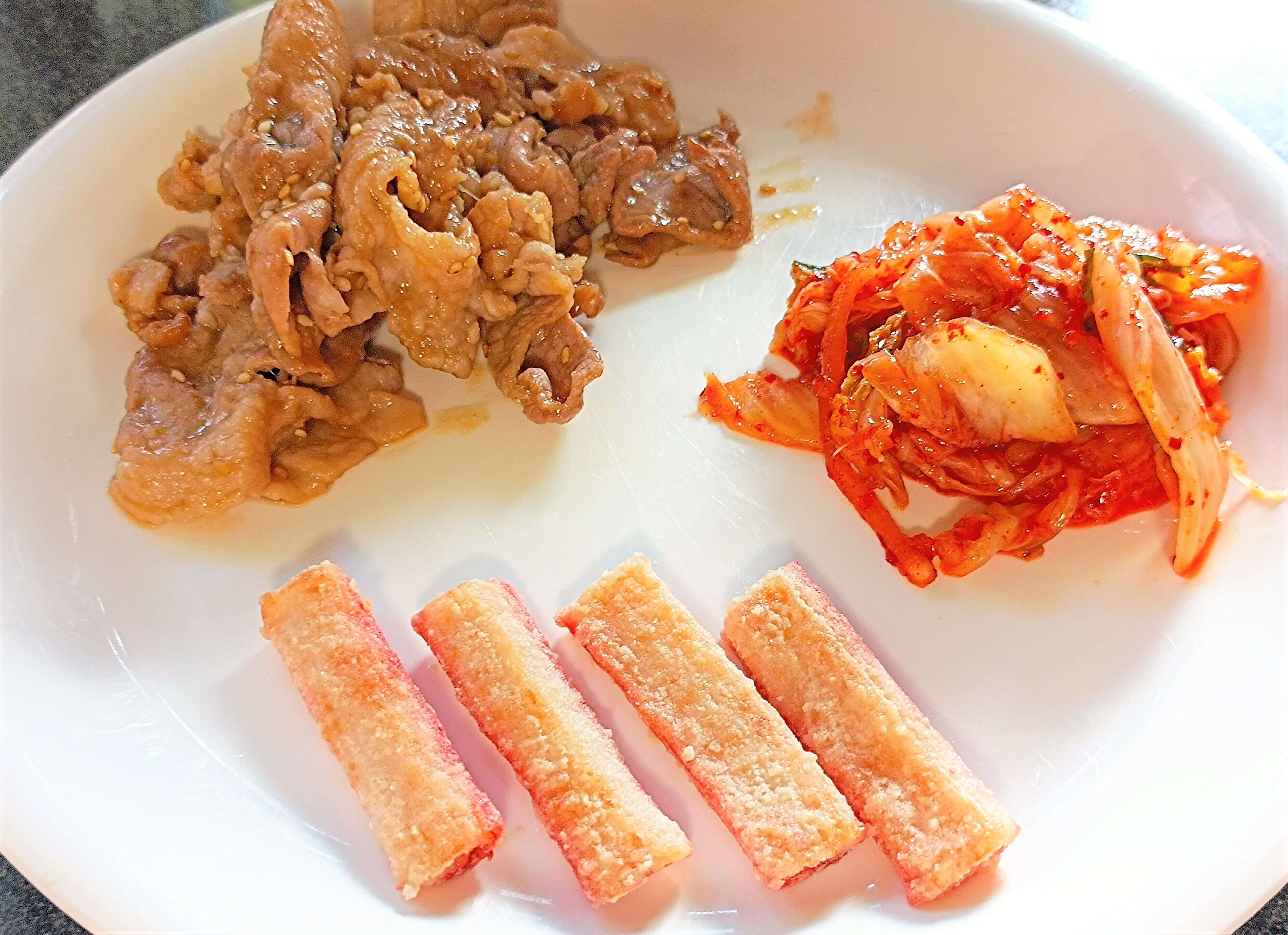 恵方巻は丸のまま恵方を向いてかじるので、断面は見えませんが、できあがりはこんな感じになります。お肉とキムチ、そして片栗粉で焼いたカニカマはそのまま食べるより美味しいですよ。