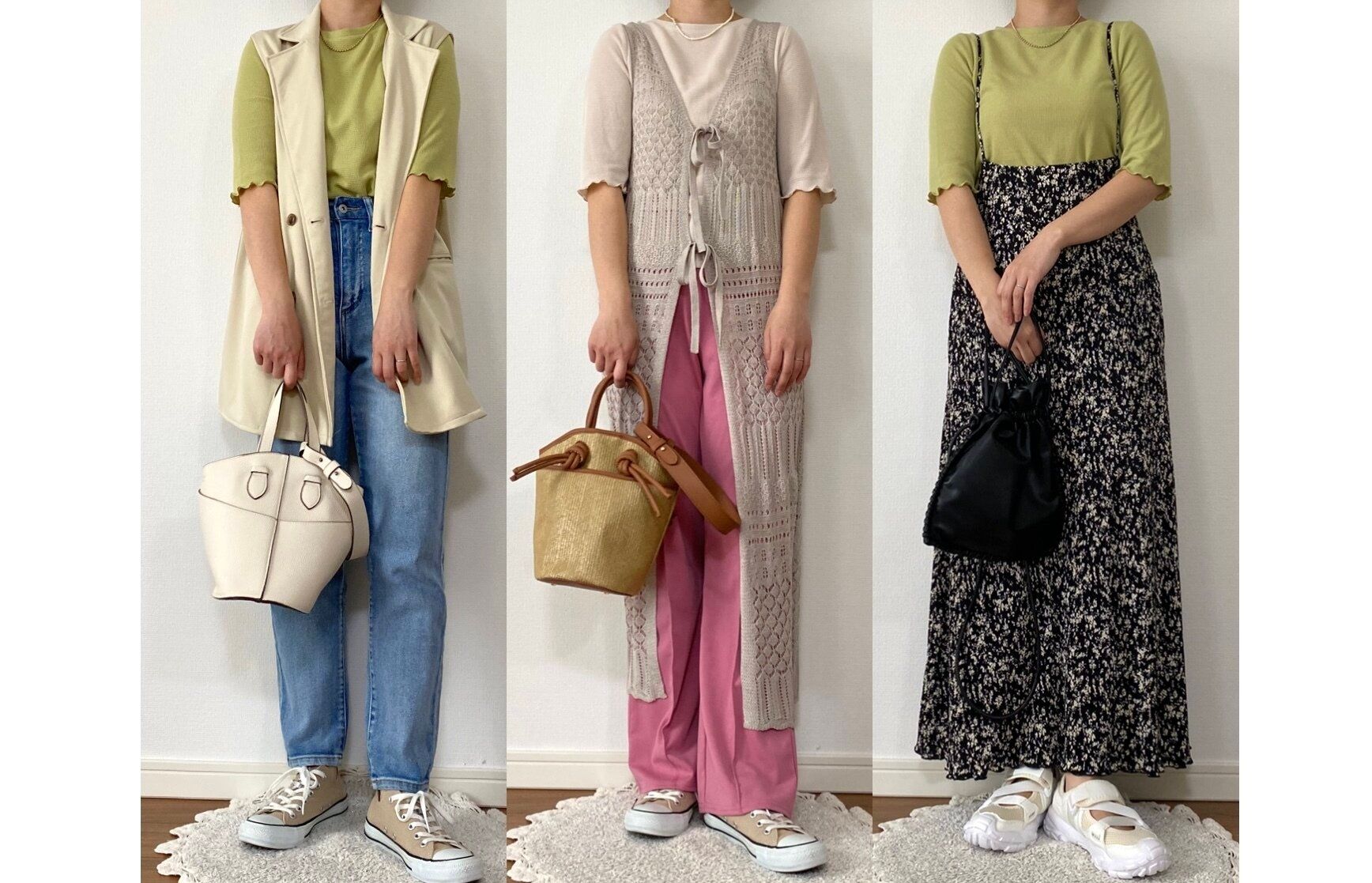 サロペットやキャミソールワンピースのインナーにも最適な生地の厚みです。ピスタチオカラーも派手すぎないのでコーデに取り入れやすくていいですね。