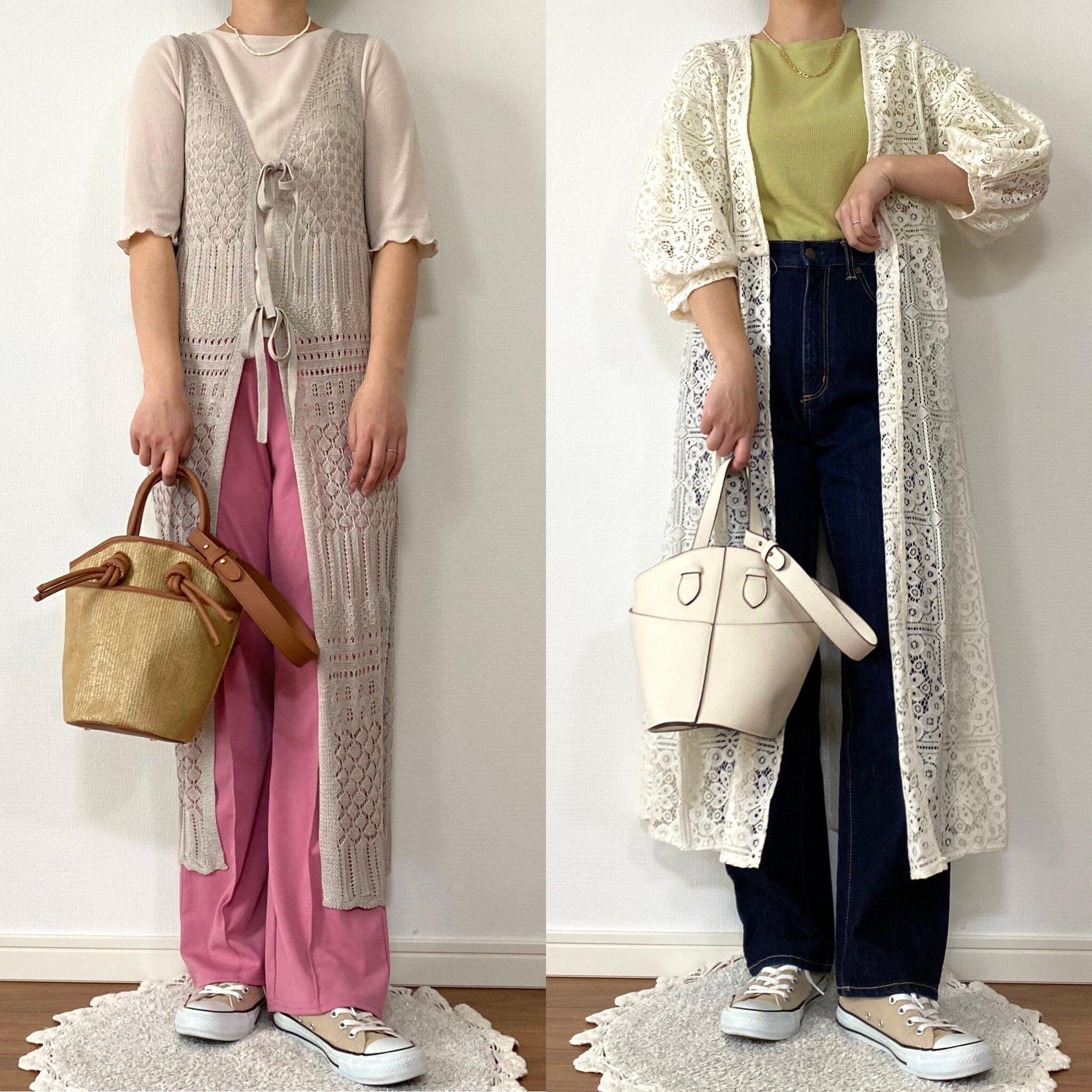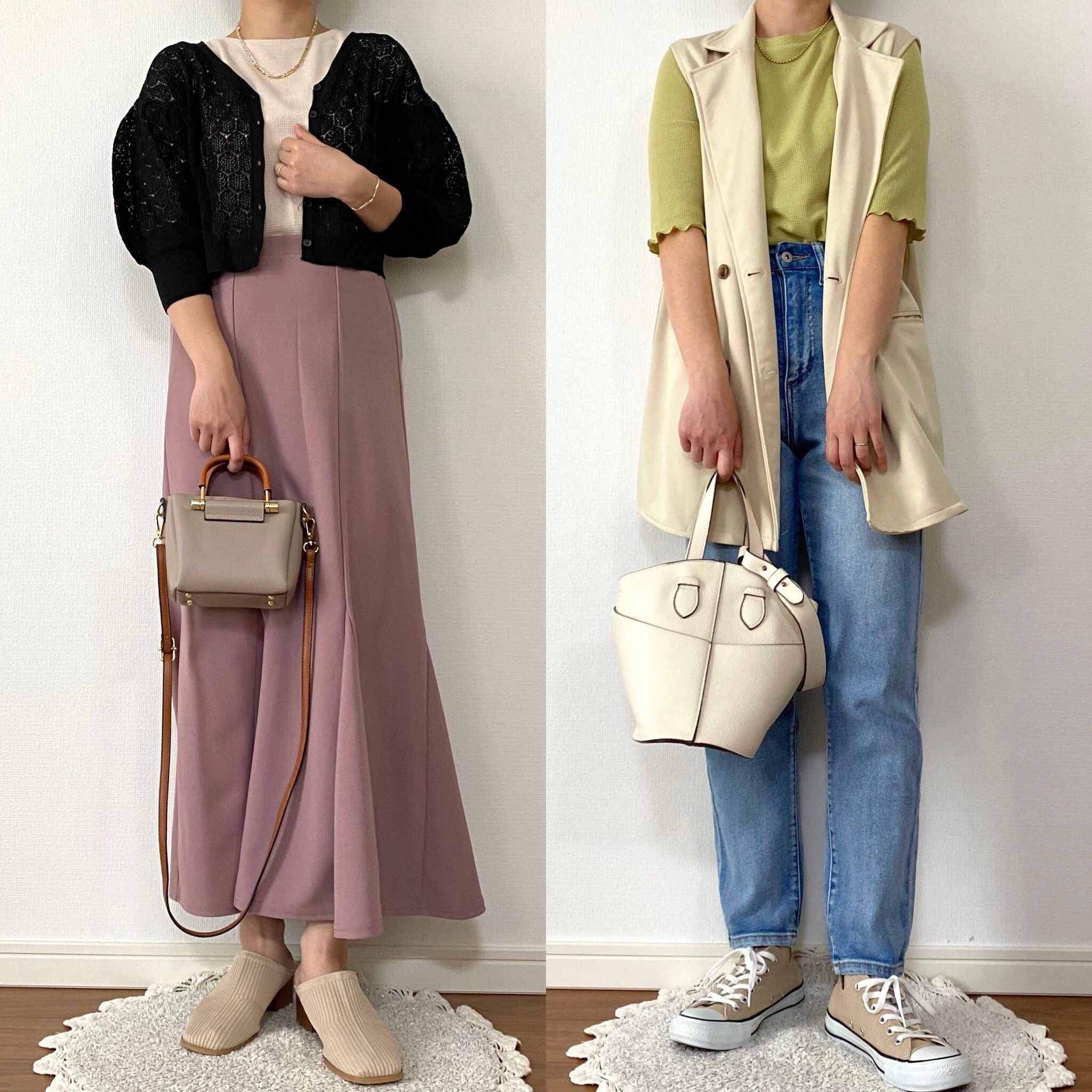万能ベージュカラーは今年トレンドの派手カラーのピンクパンツと合わせて、ピスタチオカラーはデニムとも相性抜群。