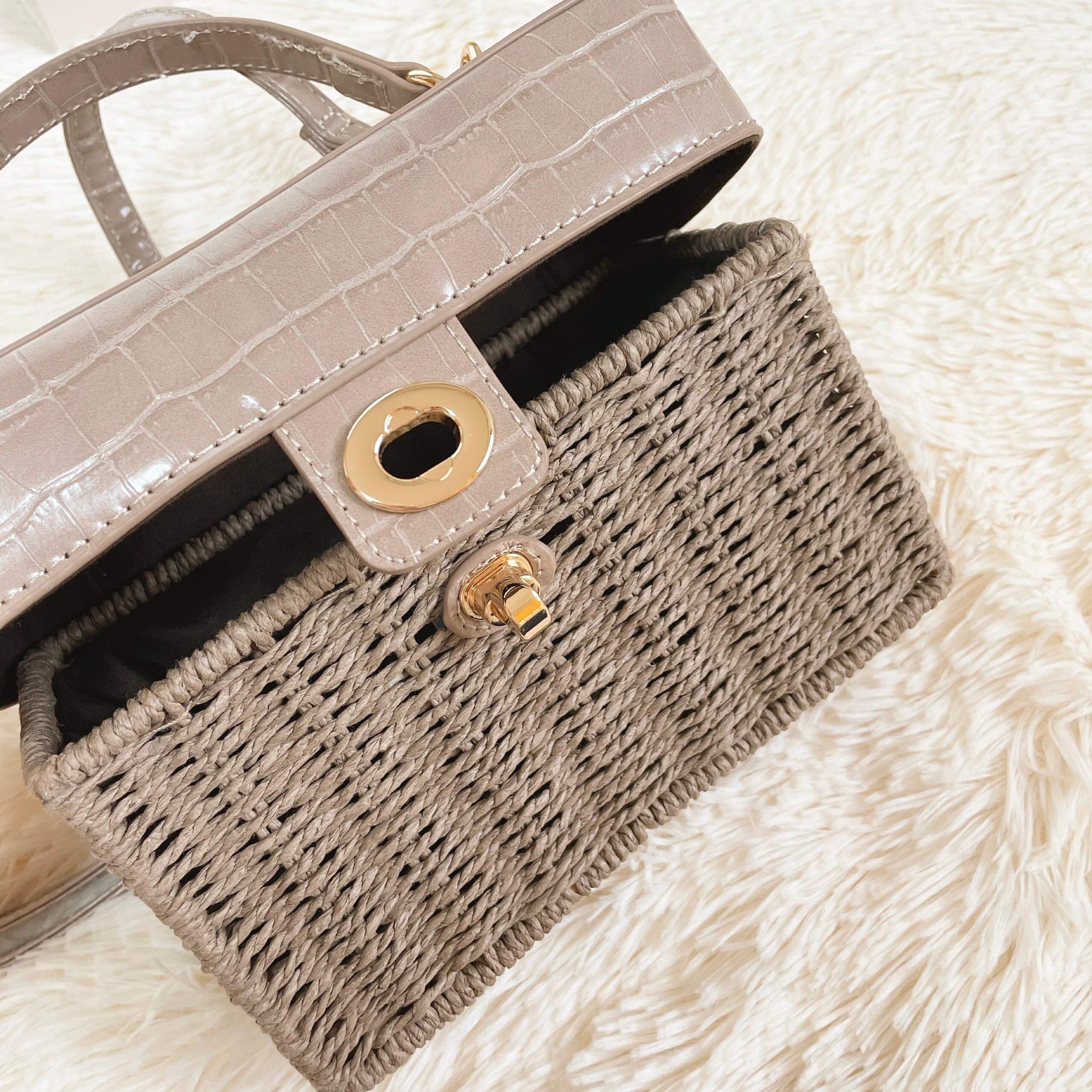 かごバッグというと甘めな印象を抱きますが、ブラックの合皮が締め色になっているのでカジュアルコーデにも使えます。