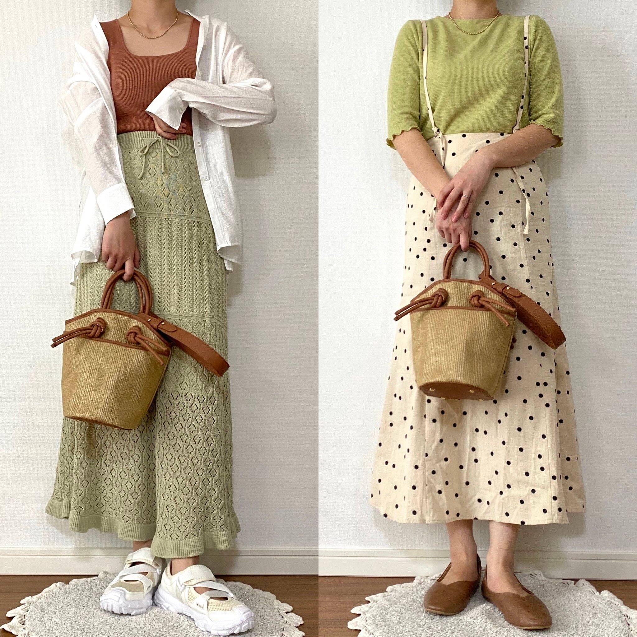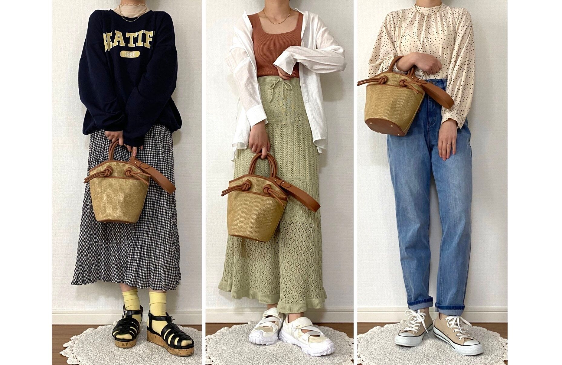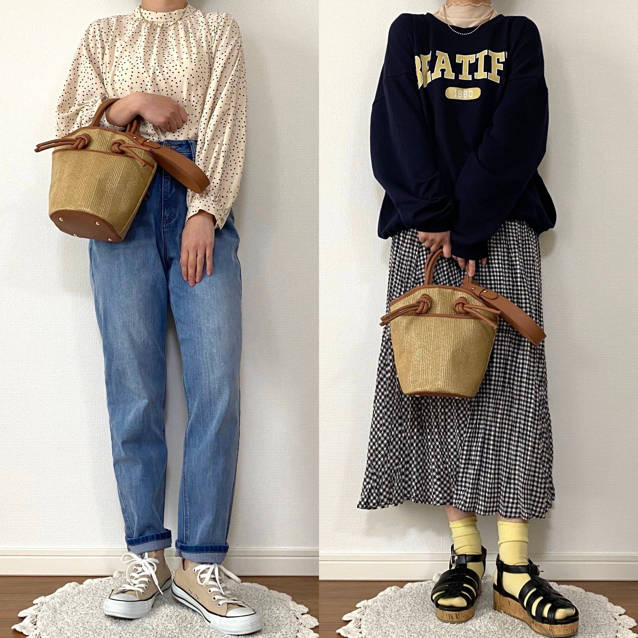 いつものバッグからカゴバッグに変えるだけでグッと季節感のあるコーデに!