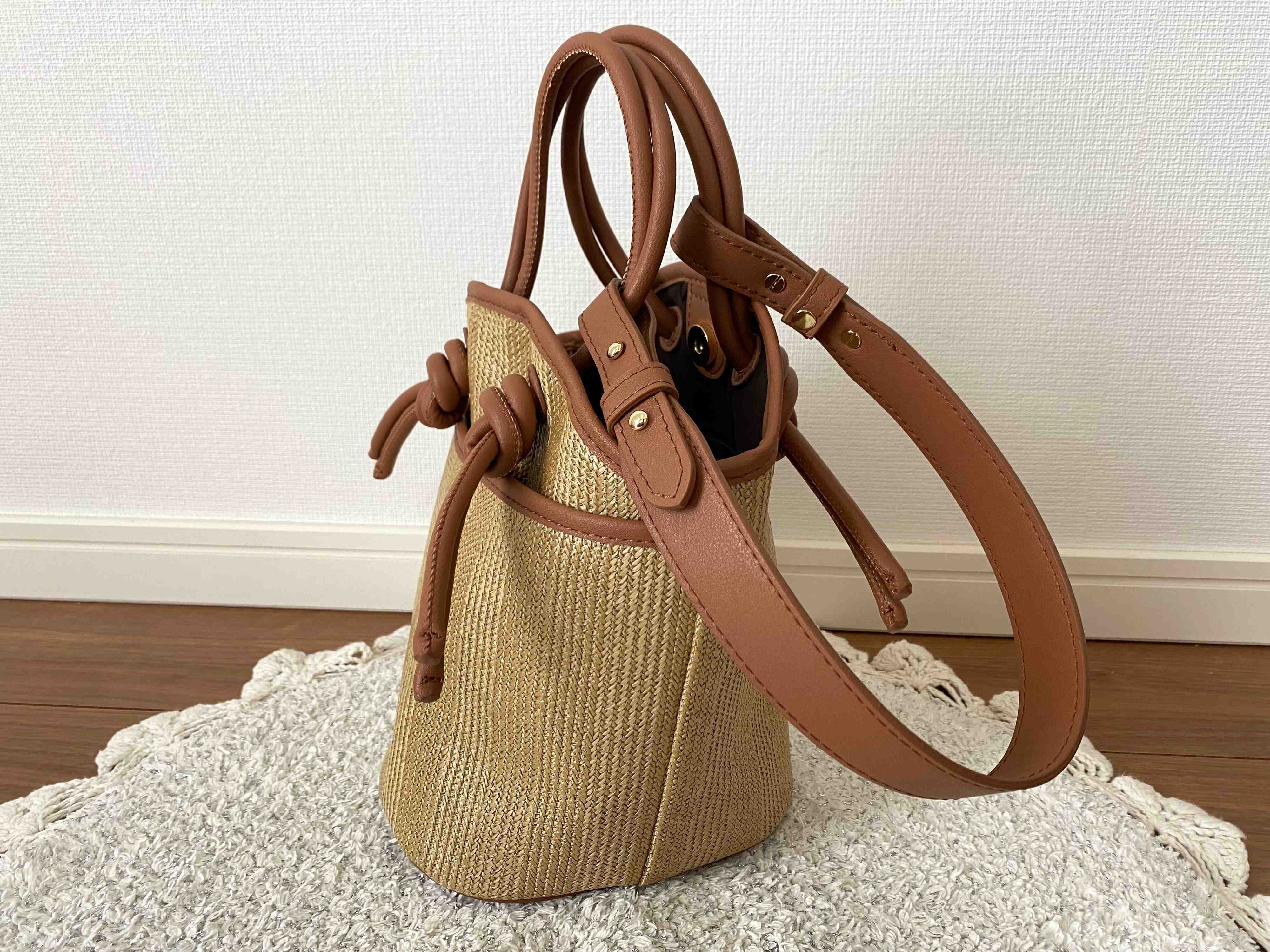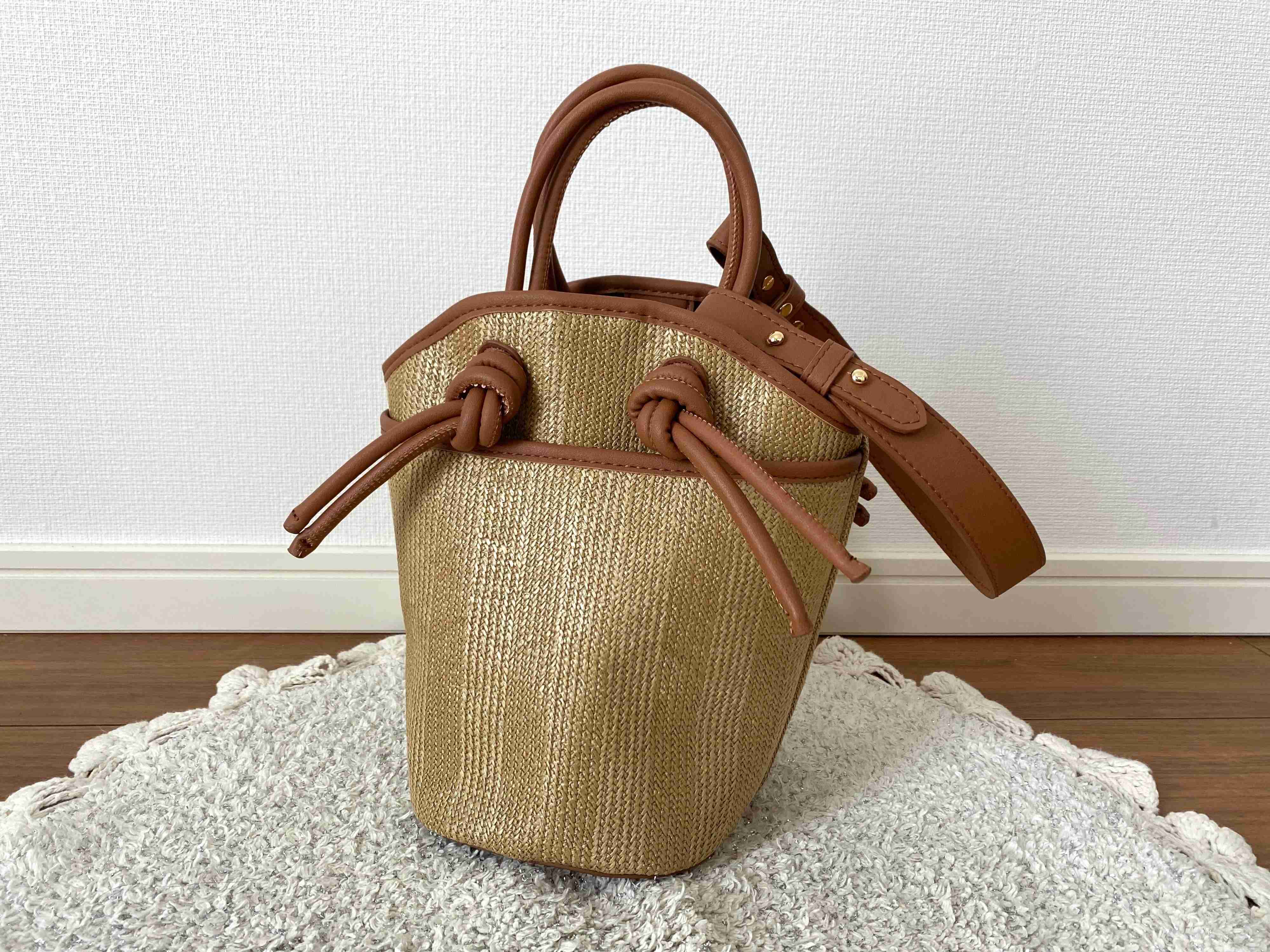 持ち手の丸紐がキュッと結ばれたデザインがトレンド感のあるカゴ風バッグです。