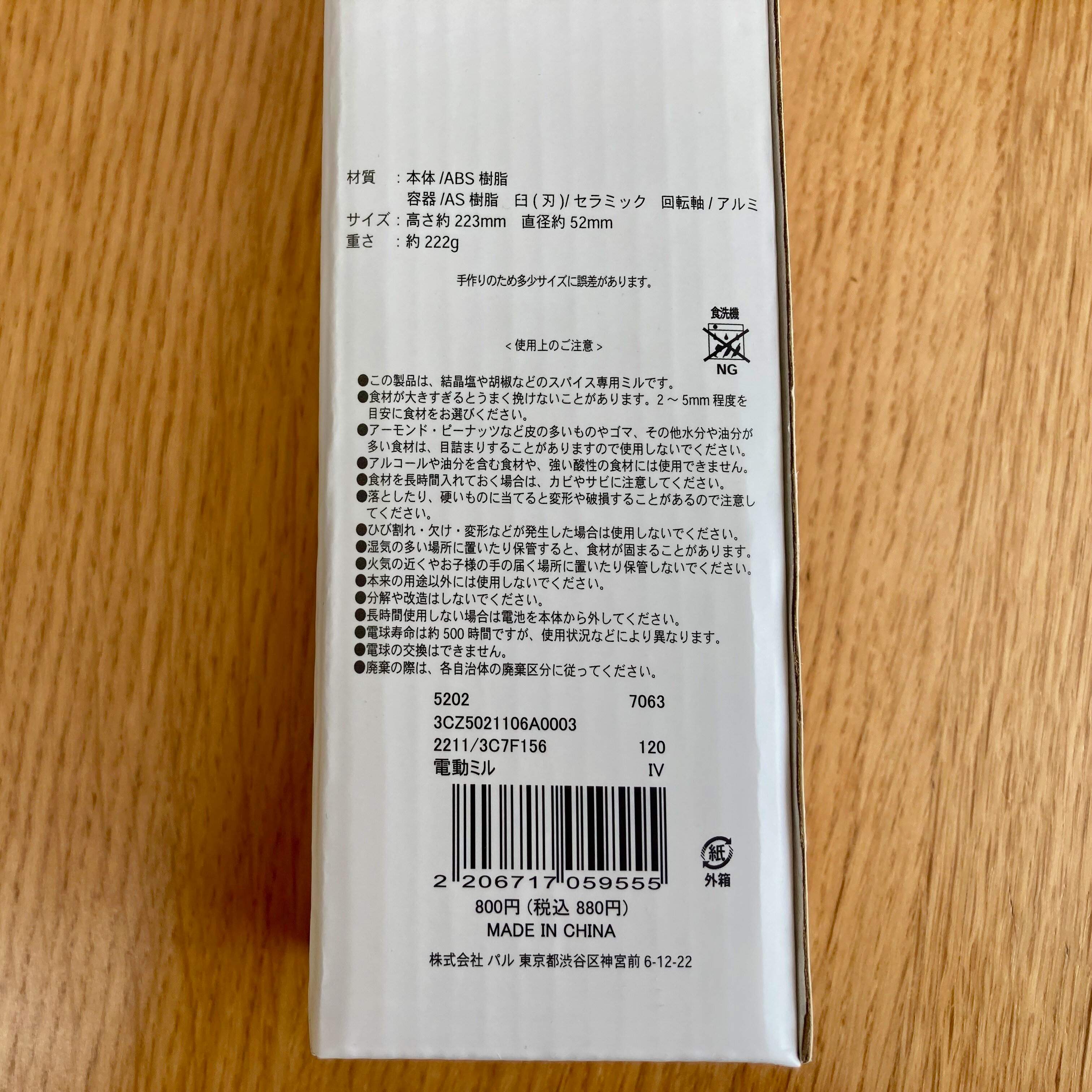 1,000円以上出すのにしっくりこないものを使うなら手動でこと足りるな、という思いが勝り、「STAY!」となったまま買わずにいたところで見つけたスリコの電動ミル! 価格は880円。色もグレージュのようなシンプルなデザインです。値段も1,000円切ってるし試してみるには十分と思い、買ってみました。