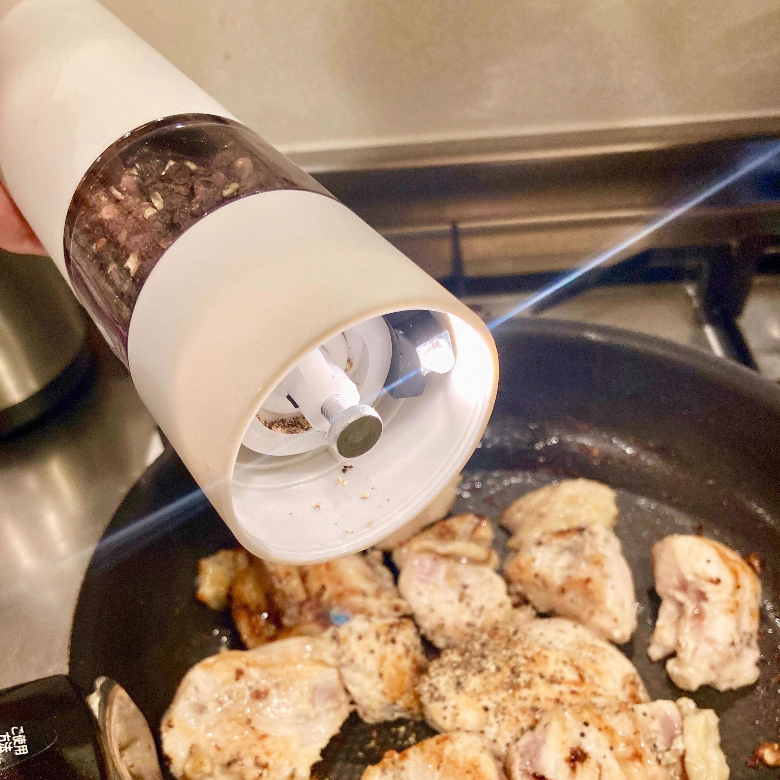 この電動ミル、ライトもつくので手元も明るくでき、どのくらいスパイスを挽いたかわかりやすいのもよきポイントです。