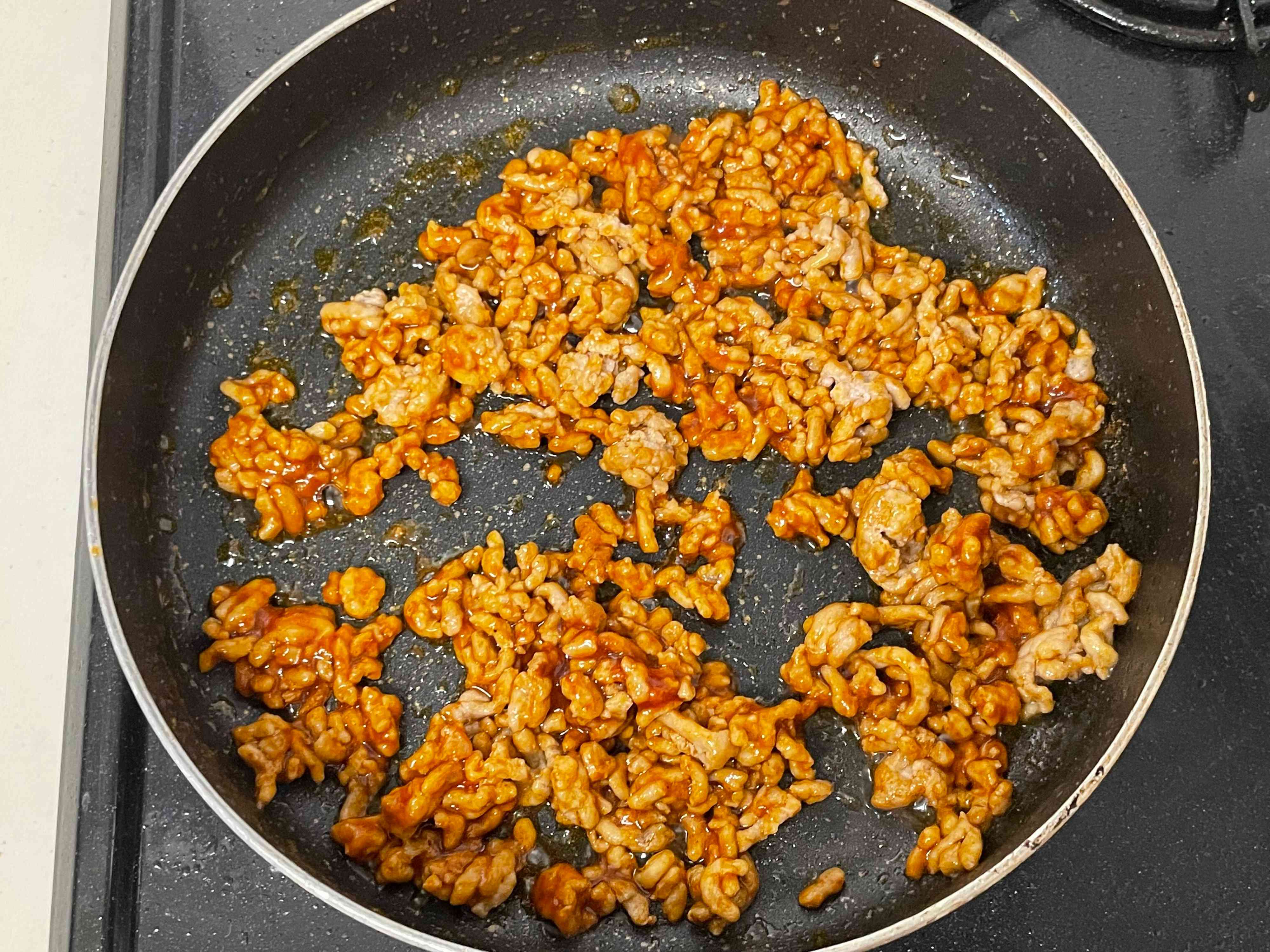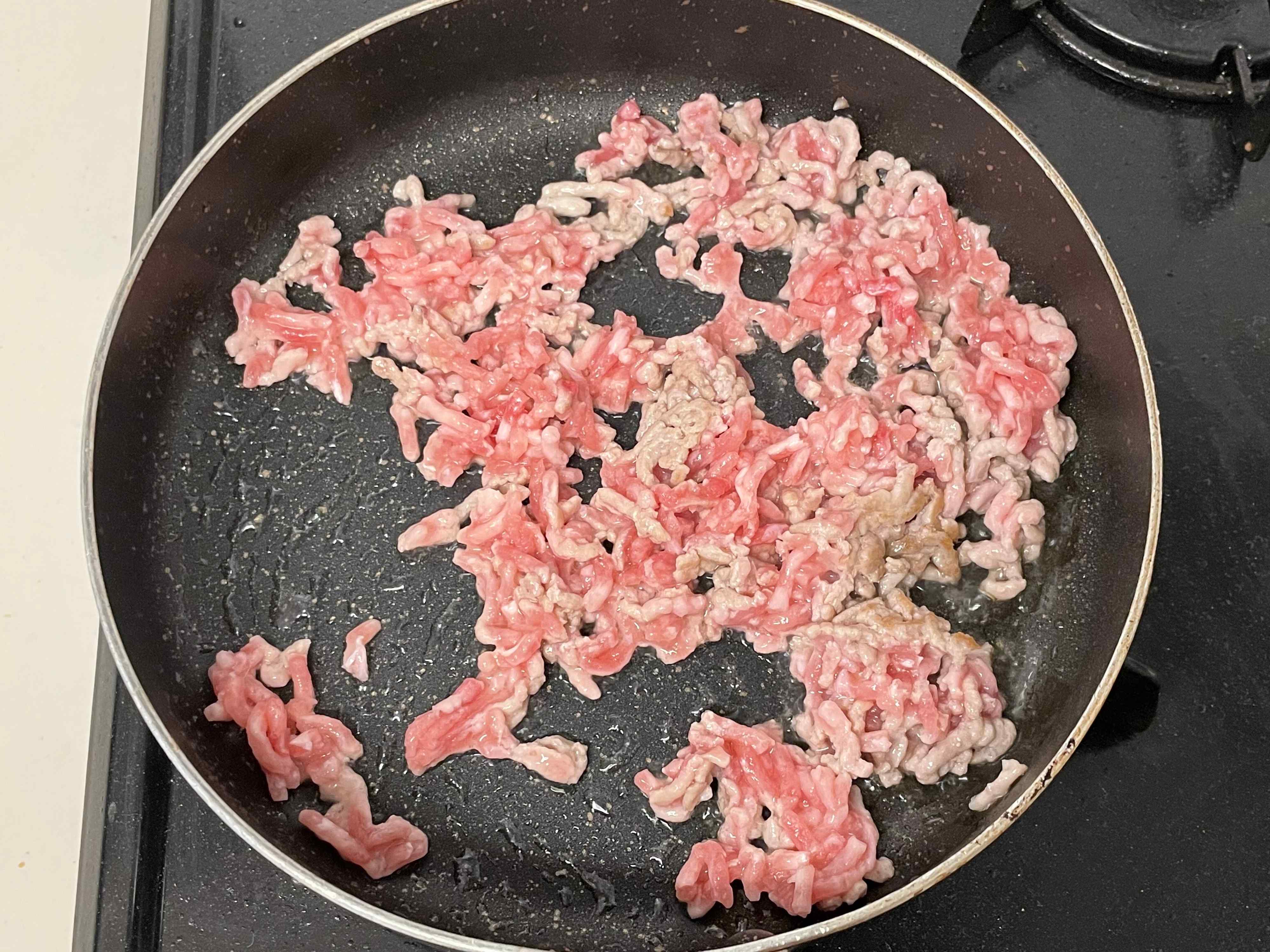 記載のとおりに、フライパンに油大さじ1/2をいれ、挽き肉を炒めます。