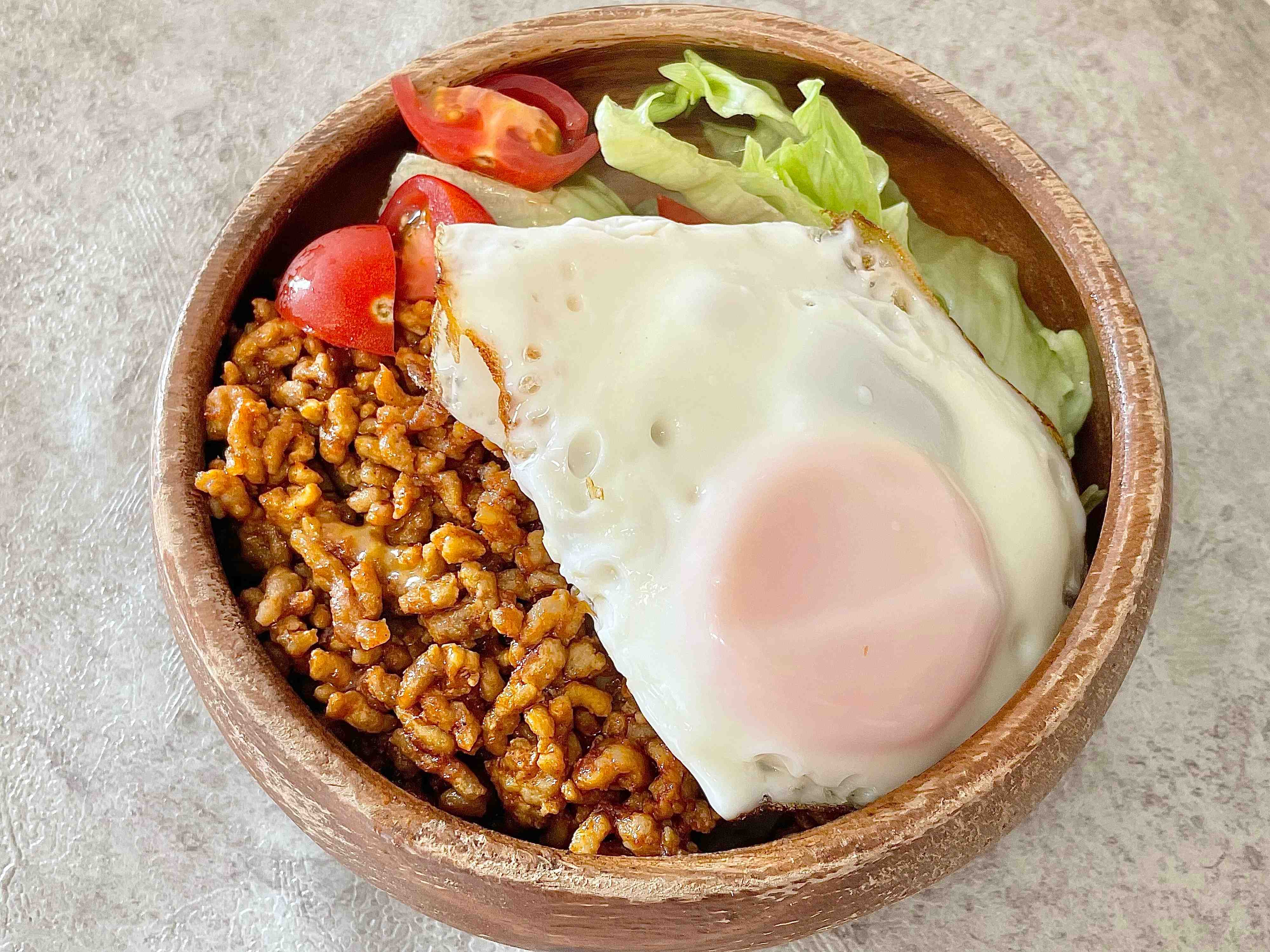 今回はレタスを敷いて、ごはん、チーズの上に挽き肉をのせ、目玉焼きとミニトマトをトッピングしました。簡単におうちカフェが楽しめます。
