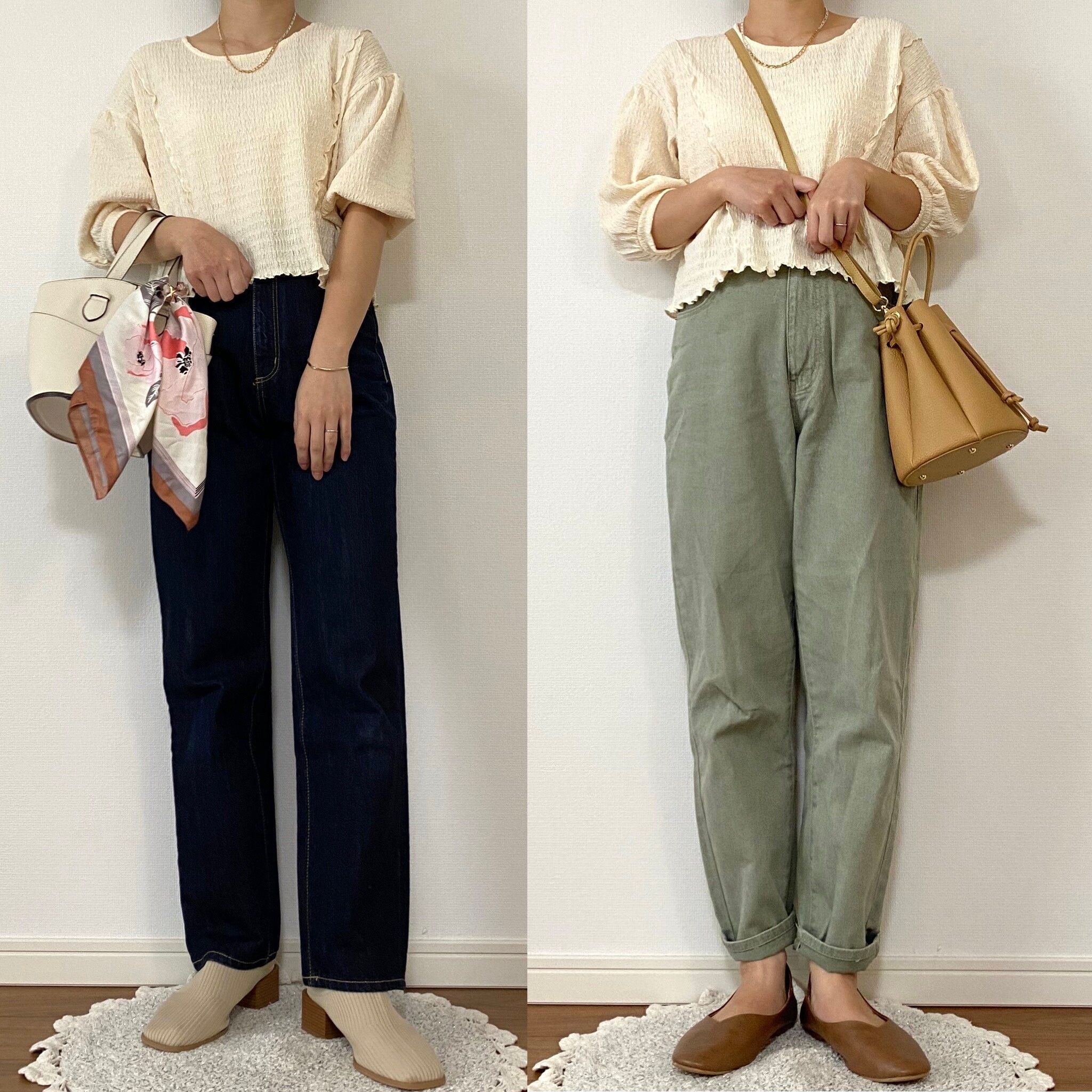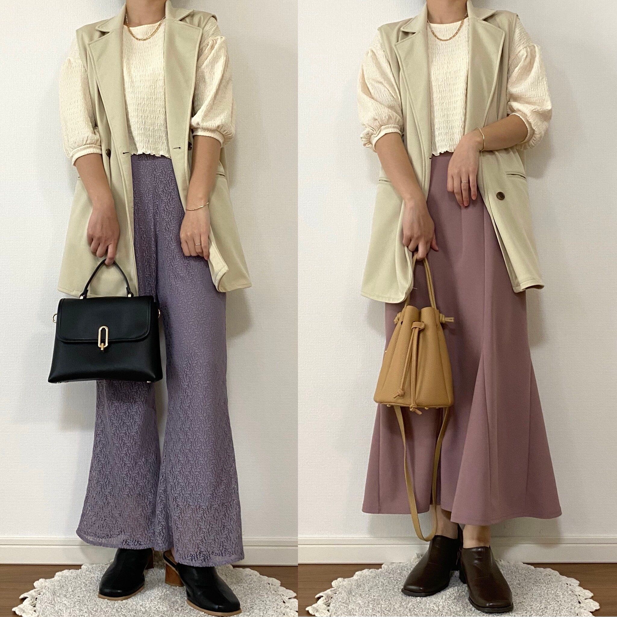 どちらも印象が変わって万能ベージュカラーはやはりいろんな着回しが楽しめそうですよね!