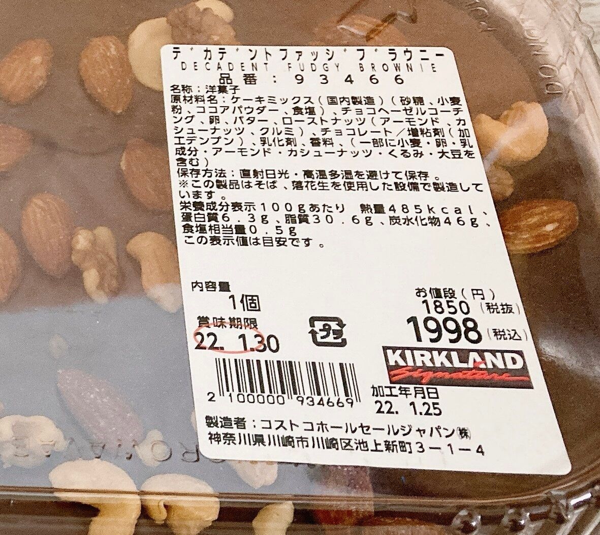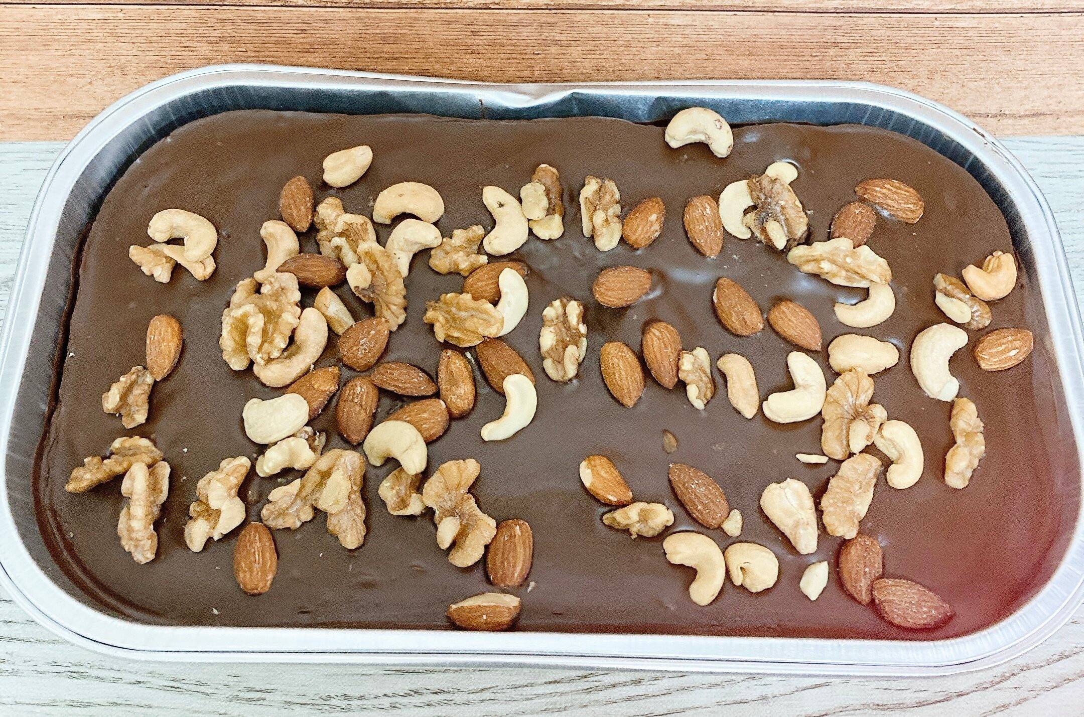 小さめにカットし食べてみると、表面のチョコはやわらかく、ブラウニーはかためで濃厚な甘さ、トッピングのナッツとチョコチップの食感が楽しいスイーツ。