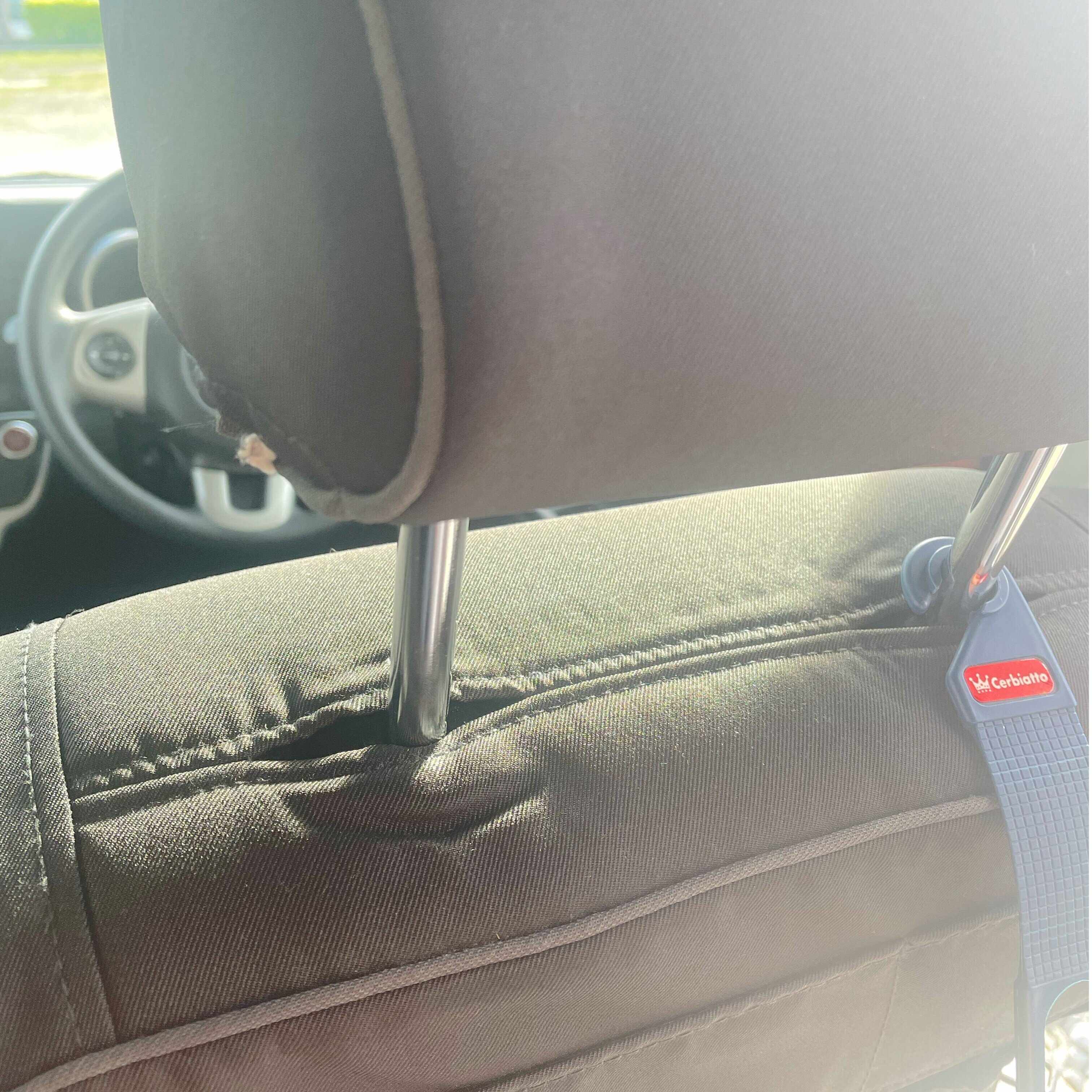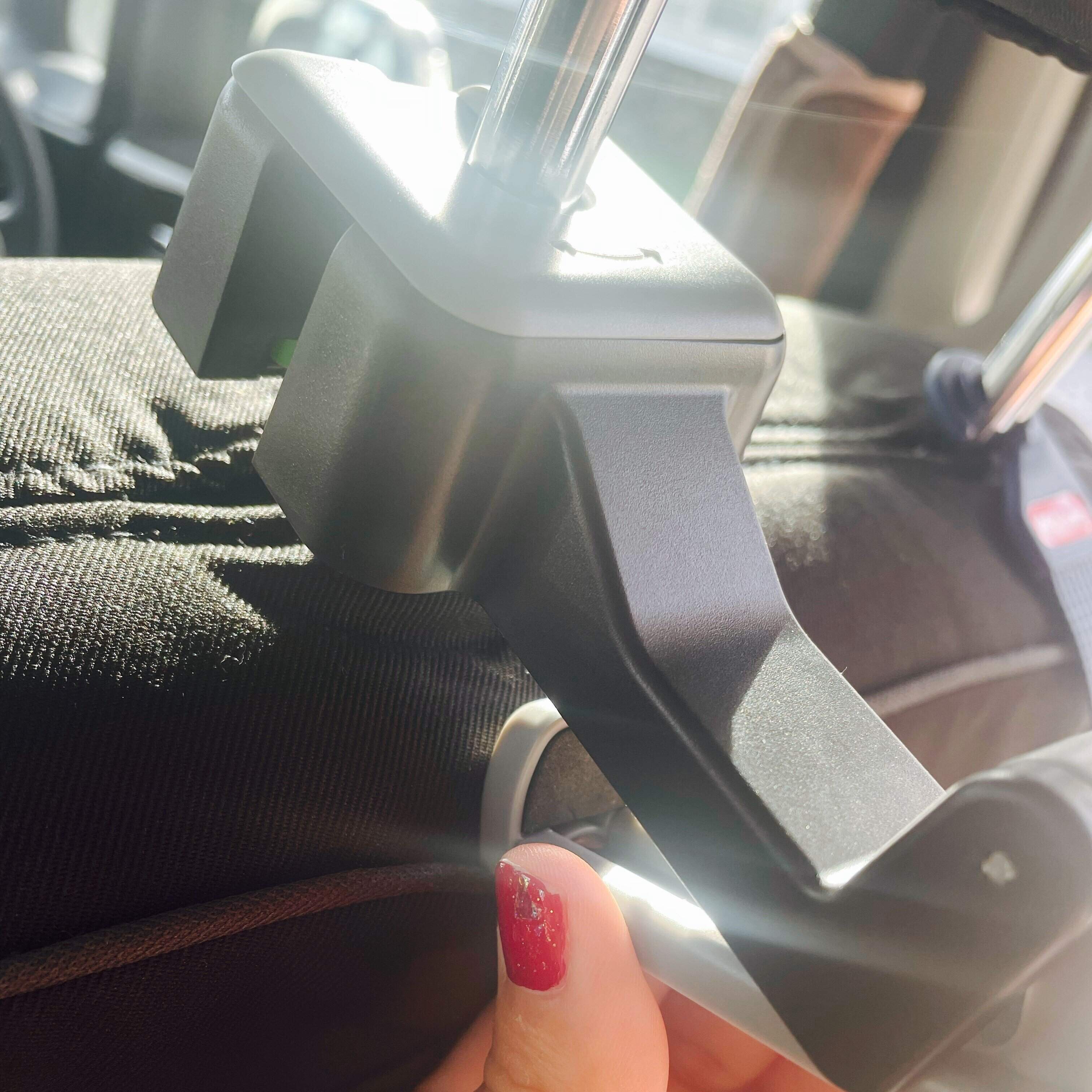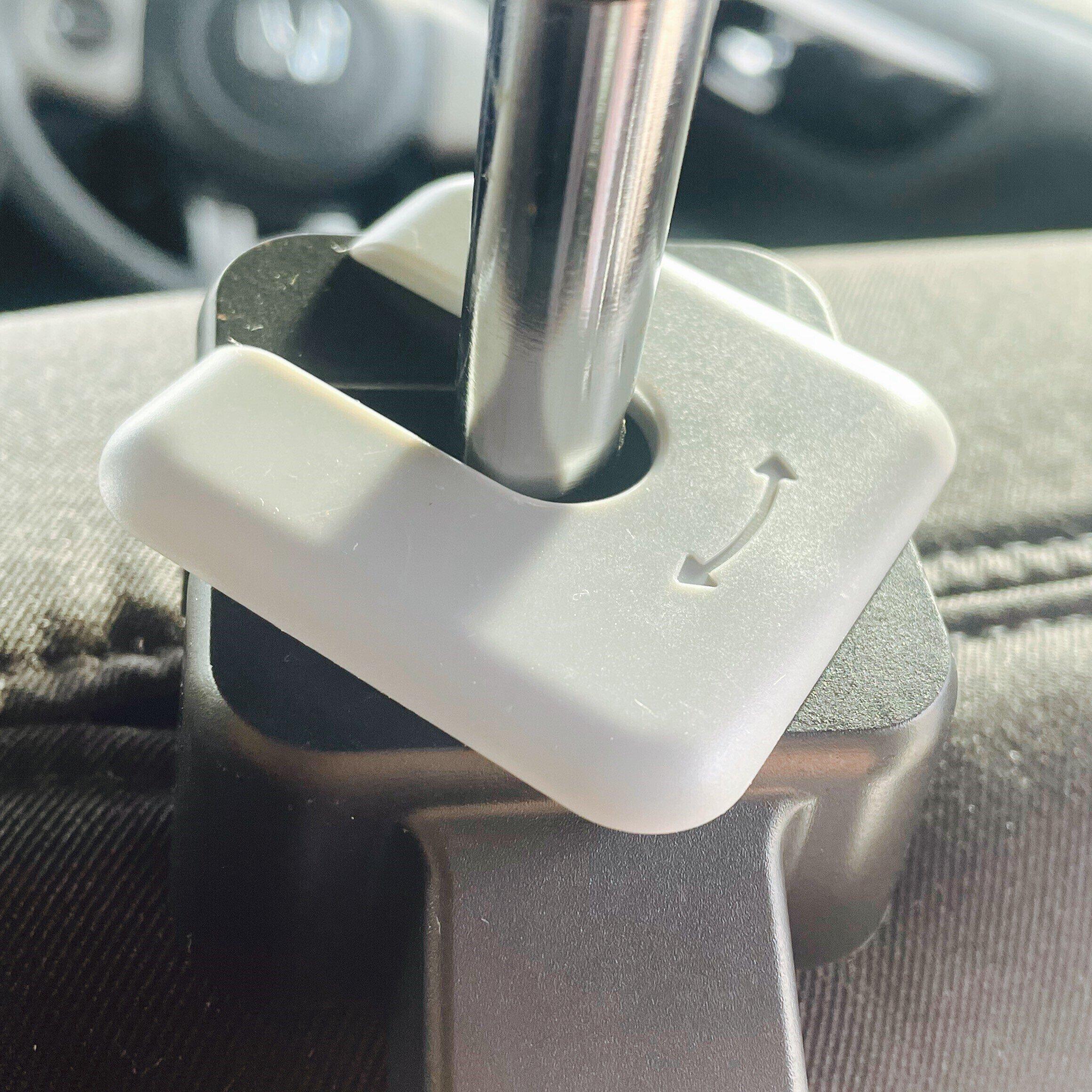 商品のコの字部分をヘッドレストに差し込み、グレー部分を回転させることで固定されます。