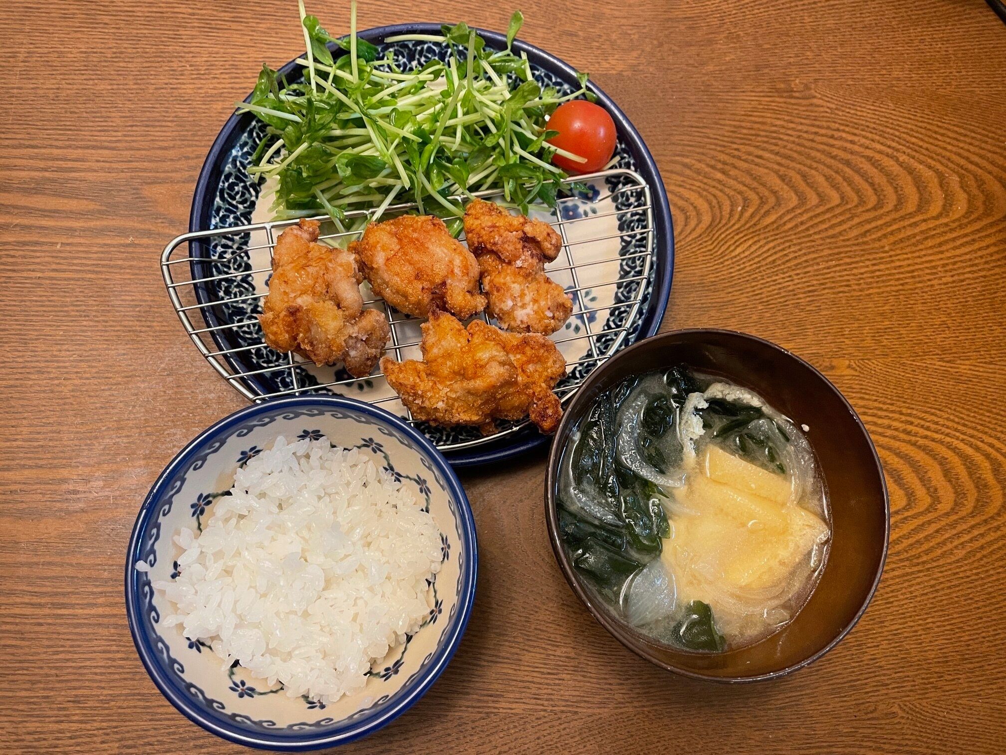 例えば、ご飯と味噌汁、から揚げに付け合わせの野菜の献立。見た目はおかずが一皿だけですが、主食のご飯と味噌汁に、たんぱく質のメインのおかずと、野菜もちゃんとありますよね。
