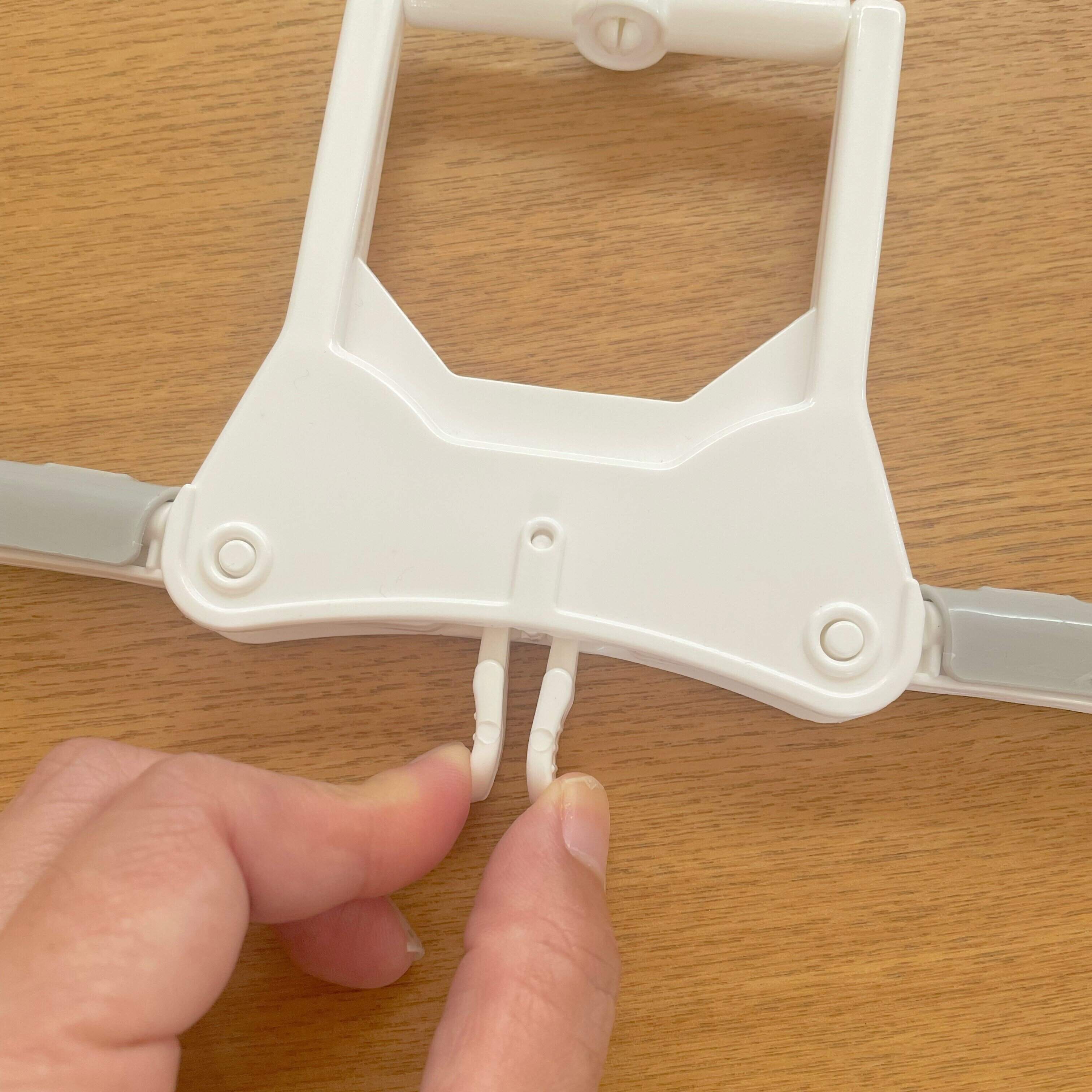 中央にあるツマミを合わせるようにするとアーム部分が折りたたまれるので、洗濯物を取り込みたたむ際にツマミを合わせてアームを折りたためば首元から簡単にハンガーを引き出すことができます!