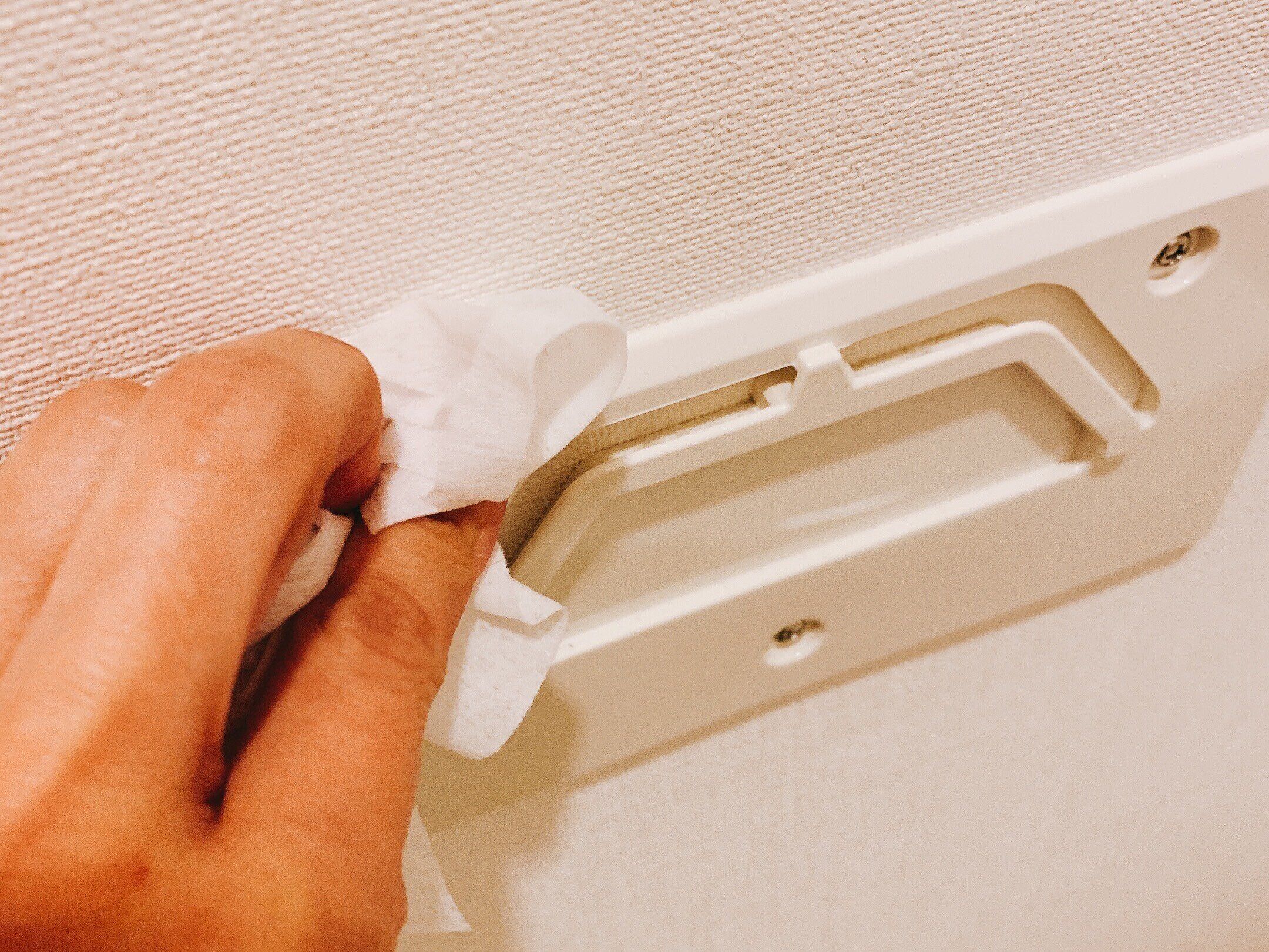 壁面に設置されている部分とパネルを拭いたらあとは元に戻すだけです。パネルと壁面を平行にして、上から下へゆっくりスライドさせながらおろしていきます。そうすると、カチッとツメが合わさる音がします。ツメがはまればOKです。しっかり固定されたか再度チェックして完了です。