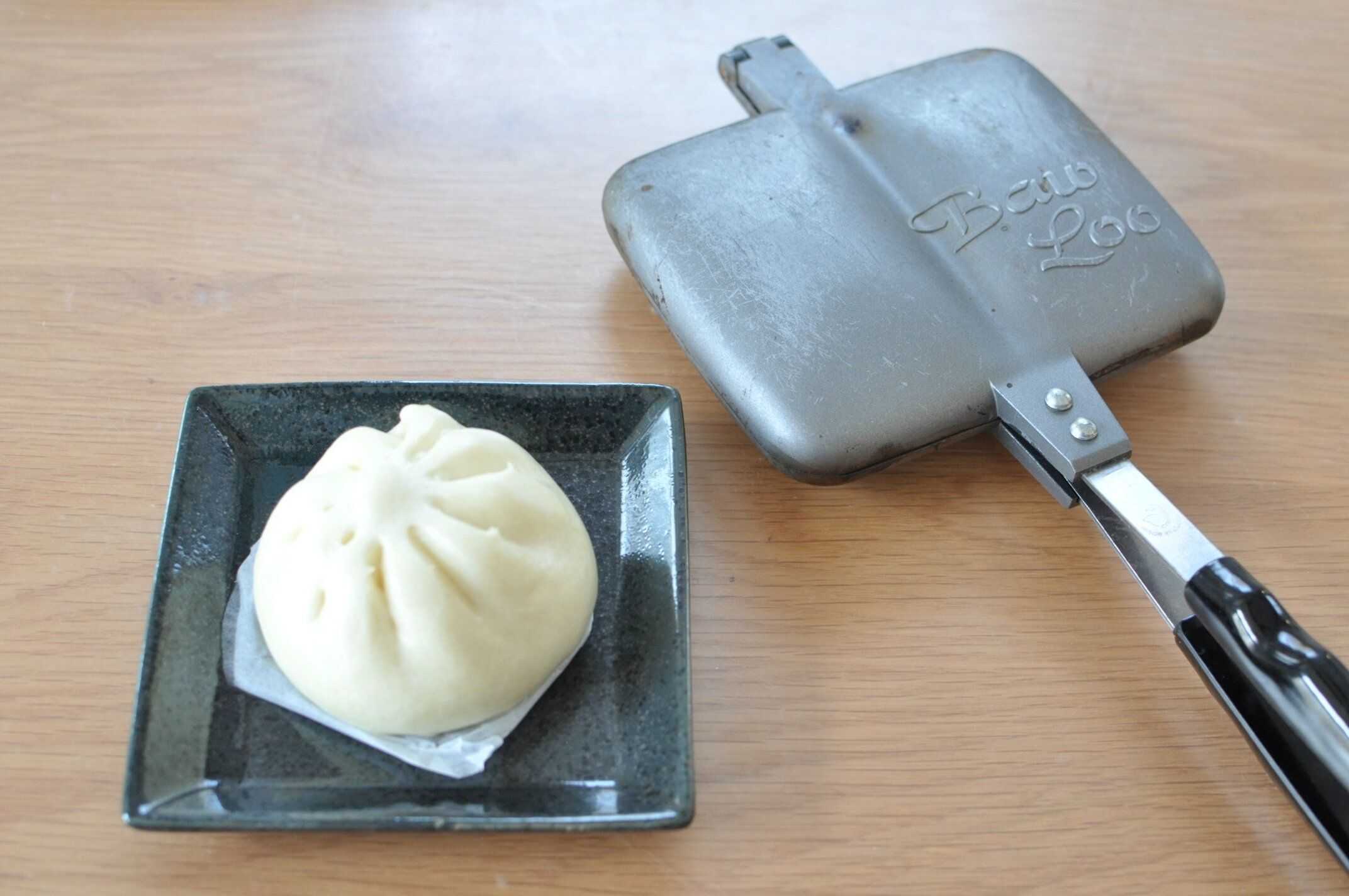 ホットサンドメーカーに肉まんを挟みます。