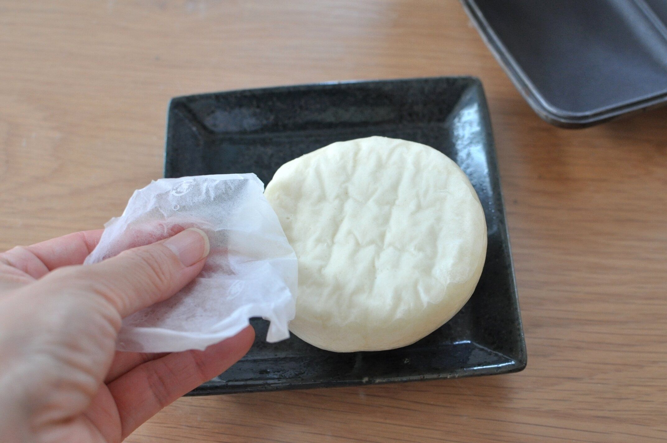 肉まんの底についている紙をはがします。