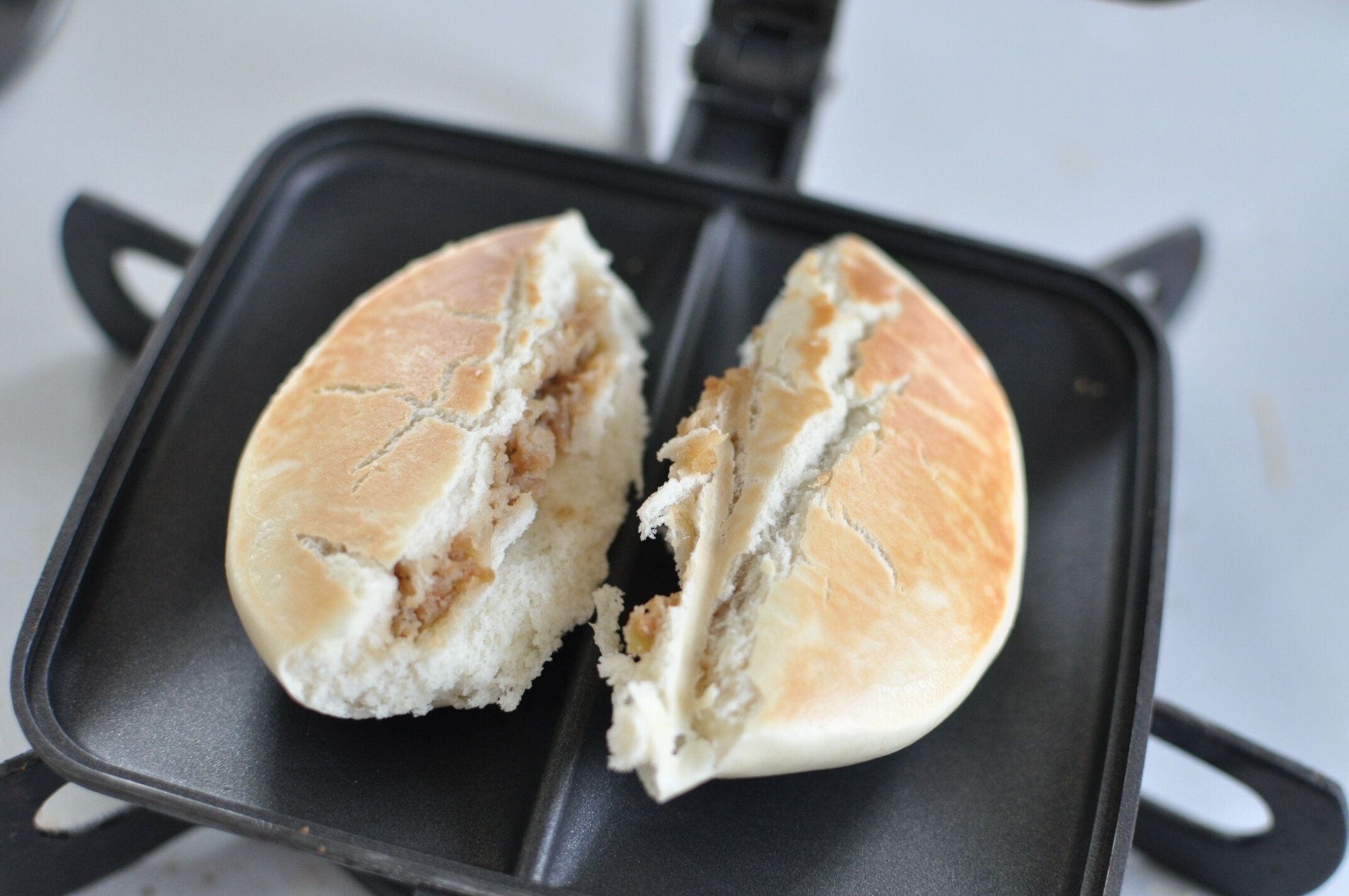 ホットサンドメーカーの形状によって、こちらのように二つに分かれたり、焼き目がついたりします。表面がカリッとして、これくらい色がついたらできあがり!